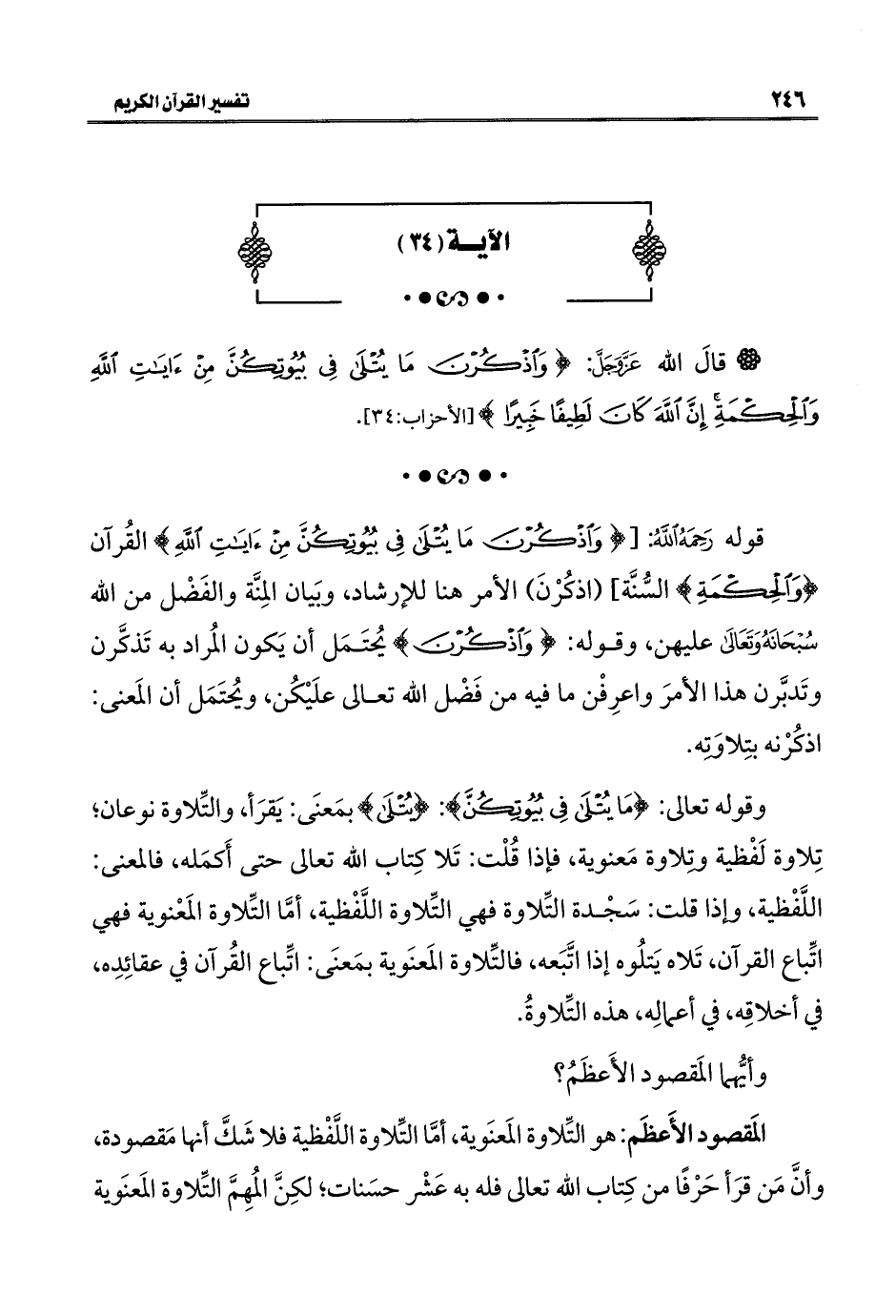 وقوله تعالى: {مَا يُتْلَى فِي بُيُوتِكُنّ}: {يُتْلَى} بمَعنَى: يَقرَأ، والتِّلاوة نوعان؛ تِلاوة لَفْظية وتِلاوة مَعنوية، فإذا قُلْت: تَلا كِتاب اللَّه تعالى حتى أَكمَله، فالمعنى: اللَّفْظية، وإذا قلت: سَجْدة التِّلاوة فهي التِّلاوة اللَّفْظية، أمَّا التِّلاوة المَعْنوية فهي اتِّباع القرآن، تَلاه يَتلُوه إذا اتَّبَعه، فالتِّلاوة المَعنَوية بمَعنَى: اتِّباع القُرآن في عقائِدِه، في أخلاقِه، في أعمالِه، هذه التِّلاوةُ.