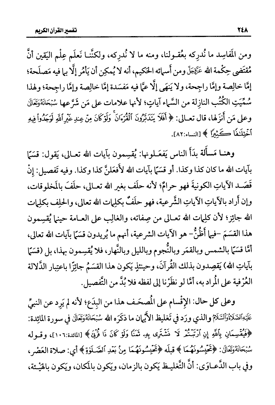 وهنا مَسأَلة بدَأَ الناس يَفعَلونها: يُقسِمون بآيات اللَّه تعالى، يَقول: قسَمًا بآيات اللَّه ما كان كذا وكذا. أو قسَمًا بآيات اللَّه لأَفعَلنَّ كذا وكذا. وفيه تَفصيل: إِنْ قَصَد الآياتِ الكونيةَ فهو حرامٌ؛ لأنه حلَف بغير اللَّه تعالى، حلَفَ بالمَخلوقات، وإن أَراد بالآياتِ الآياتِ الشَّرعية، فهو حلَفٌ بكلِمات اللَّه تعالى، والحلِف بكلِمات اللَّه جائِز؛ لأن كلِمات اللَّه تعالى من صِفاته، والغالِب على العامة حينما يُقسِمون هذا القسَمَ -فيما أَظُنُّ- هو الآيات الشرعية، أنهم ما يُريدون قسَمًا بآيات اللَّه تعالى، أمَّا قسَمًا بالشمس وبالقمَر وبالنُّجوم وبالليل وبالنَّهار، فلا يُقسِمون بهذا، بل (قسَمًا بآياتِ اللَّه) يَقصِدون بذلك القُرآنَ، وحينئذٍ يَكون هذا القسَمُ جائِزًا باعتِبار الدَّلالة العُرْفية على المُراد به، أمَّا لو نظَرْنا إلى لفظه فلا بُدَّ من التَّفصيل.