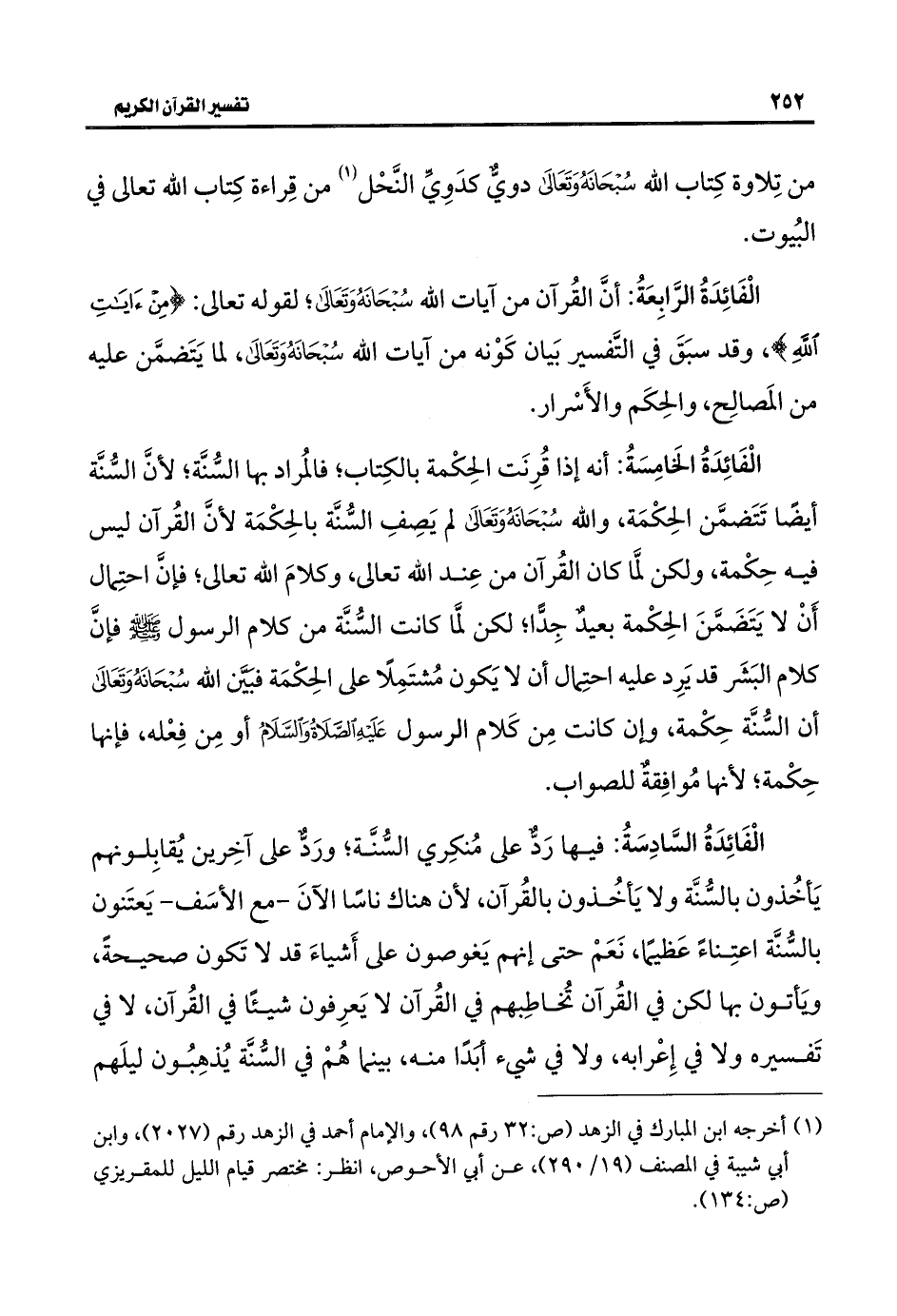 الْفَائِدَةُ السَّادِسَةُ: فيها رَدٌّ على مُنكِري السُّنَّة، ورَدٌّ على آخِرين يُقابِلونهم يَأخُذون بالسُّنَّة ولا يَأخُذون بالقُرآن، لأن هناك ناسًا الآنَ -مع الأسَف- يَعتَنون بالسُّنَّة اعتِناءً عَظيمًا، نَعَمْ حتى إنهم يَغوصون على أَشياءَ قد لا تَكون صحيحةً، ويَأتون بها لكن في القُرآن تُخاطِبهم في القُرآن لا يَعرِفون شيئًا في القُرآن، لا في تَفسيره ولا في إِعْرابه، ولا في شيء أبَدًا منه، بينما هُمْ في السُّنَّة يُذهِبُون ليلَهم