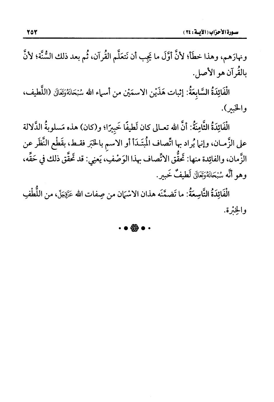الْفَائِدَةُ الثَّامِنةُ: أنَّ اللَّه تعالى كان لَطيفًا خَبِيرًا، و (كان) هذه مَسلوبةُ الدَّلالة على الزَّمان، وإنما يُراد بها اتِّصاف المُبتَدَأ أو الاسمِ بالخَبَر فقط، بقَطْع النَّظَر عن الزَّمان، والفائِدة منها: تَحقُّق الاتِّصاف بهذا الوَصْفِ، يَعنِي: قد تَحقَّق ذلك في حَقِّه، وهو أنَّه سُبْحَانَهُ وَتَعَالَى لَطيفٌ خَبير.