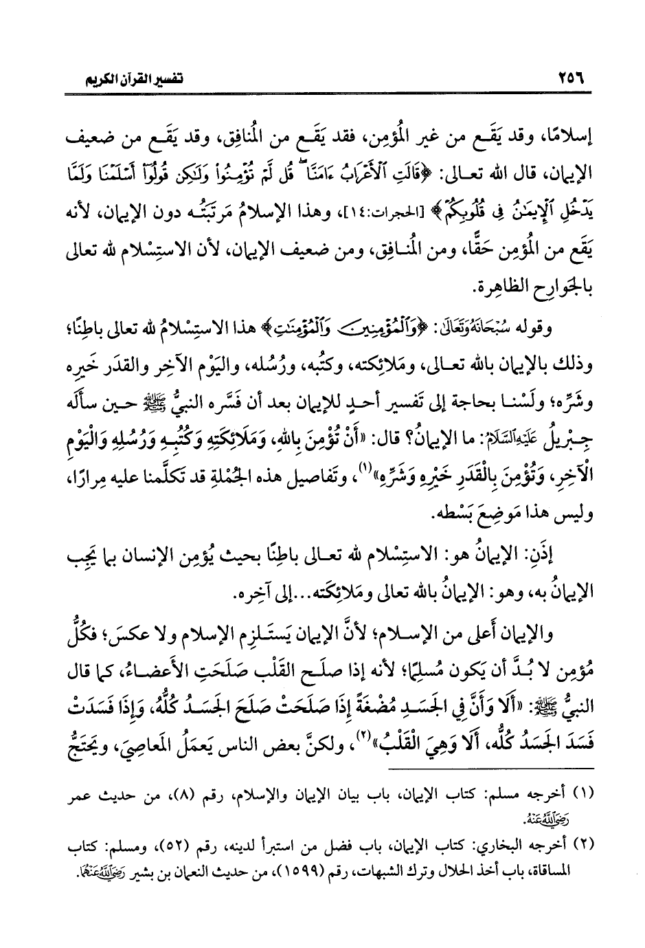 والإيمان أَعلى من الإسلام؛ لأنَّ الإيمان يَستَلزِم الإسلام ولا عكسَ؛ فكُلُّ مُؤمِن لا بُدَّ أن يَكون مُسلِمًا؛ لأنه إذا صلَح القَلْب صَلَحَتِ الأَعضاءُ، كما قال النبيُّ -صلى اللَّه عليه وسلم-: "أَلا وَأَنَّ فِي الجَسَدِ مُضْغَةً إِذَا صَلَحَتْ صَلَحَ الجَسَدُ كلُّهُ، وَإِذَا فَسَدَتْ فَسَدَ الجَسَدُ كلُّه، أَلا وَهِيَ الْقَلْبُ" (¬٢)، ولكنَّ بعض الناس يَعمَلُ المَعاصِيَ، ويَحتَجُّ