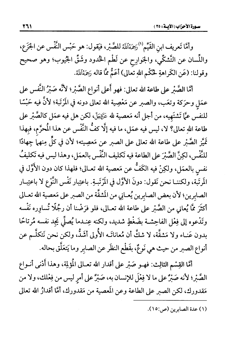وأمَّا تَعريف ابنِ القَيِّم (¬١) رَحِمَهُ اللَّهُ للصَّبْر، فيَقول: هو حَبْس النَّفْس عن الجَزَع، واللِّسان عن التَّشكِّي، والجَوارِحِ عن لَطْم الخُدود وشَقِّ الجُيوب؛ وهو صحيح وقولنا: (عَن الكَراهةِ لحُكْم اللَّهِ تعالى) أعَمُّ ممَّا قاله رَحِمَهُ اللَّهُ.