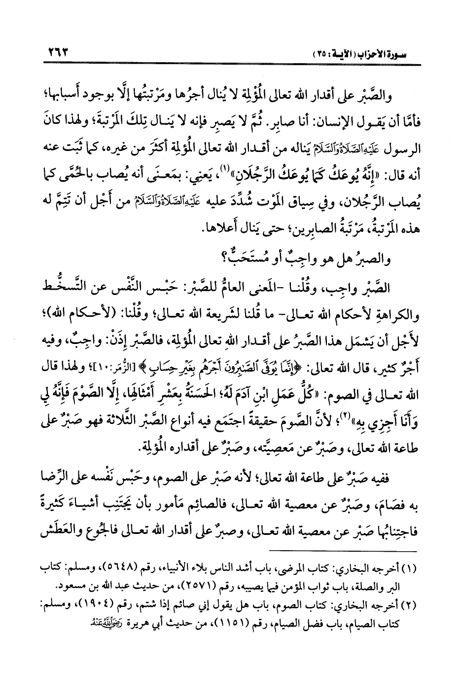 الصَّبْر واجِب، وقُلْنا -المَعنى العامُّ للصَّبْر: حَبْس النَّفْس عن التَّسخُّط والكراهةِ لأحكام اللَّه تعالى- ما قُلنا لشَريعة اللَّه تعالى؛ وقُلْنا: (لأحكام اللَّه)؛ لأَجْل أن يَشمَل هذا الصَّبرُ على أقدار اللَّهِ تعالى المُؤلمِة، فالصَّبْر إِذَنْ: واجِبٌ، وفيه أَجْرٌ كثير، قال اللَّه تعالى: {إِنَّمَا يُوَفَّى الصَّابِرُونَ أَجْرَهُمْ بِغَيْرِ حِسَابٍ} [الزمر: ١٠]؛ ولهذا قال اللَّه تعالى في الصوم: "كُلُّ عَمَلِ ابْنِ آدَمَ لَهُ، الحَسَنهُ بِعَشْرِ أَمْثَالهَا، إِلَّا الصَّوْمَ فَإِنَّهُ لِي وَأَنا أَجِزِي بِهِ" (¬٢)؛ لأنَّ الصَّومَ حقيقةً اجتَمَع فيه أنواع الصَّبْر الثَّلاثة فهو صَبرٌ على طاعة اللَّه تعالى، وصَبْرٌ عن مَعصِيَّته، وصَبرٌ على أقداره المُؤلمِة.
