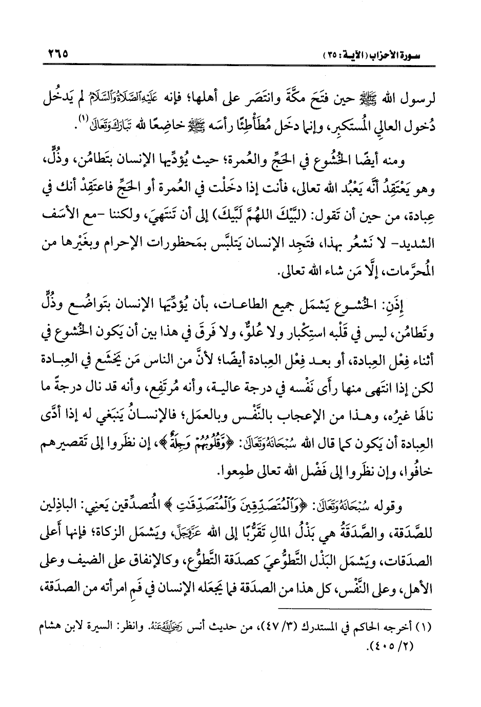 ومنه أيضًا الخُشُوع في الحجِّ والعُمرة؛ حيث يُؤدِّيها الإنسان بتَطامُن، وذُلٍّ، وهو يَعْتَقِدُ أنَّه يَعْبُد اللَّه تعالى، فأنت إذا دخَلْت في العُمرة أو الحَجِّ فاعتَقِدْ أنك في عِبادة، من حين أن تَقول: (لبَّيْكَ اللهُمَّ لَبَّيكَ) إلى أن تَنتَهيَ، ولكننا -مع الأسَف الشديد- لا نَشعُر بهذا، فتَجِد الإنسان يَتلبَّس بمَحظورات الإحرام وبغَيْرها من المُحرَّمات، إلَّا مَن شاء اللَّه تعالى.