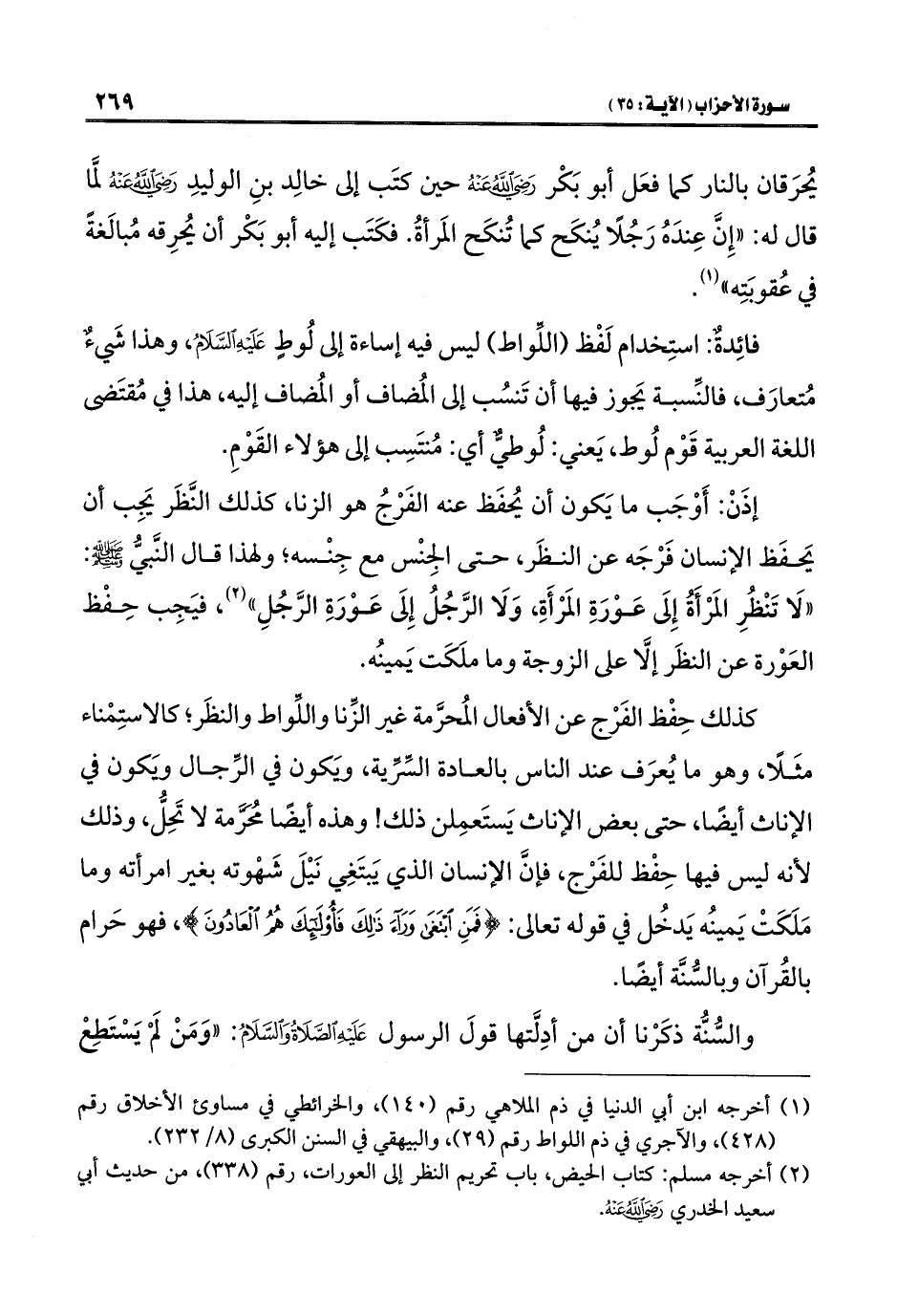 فائِدةٌ: استِخدام لَفْظ (اللِّواط) ليس فيه إساءة إلى لُوطٍ عَلَيْهِ السَّلامُ، وهذا شَيءٌ مُتعارَف، فالنِّسبة يَجوز فيها أن تَنسُب إلى المُضاف أو المُضاف إليه، هذا في مُقتَضى اللغة العربية قَوْم لُوط، يَعني: لُوطيٌّ أي: مُنتَسِب إلى هؤلاء القَوْمِ.