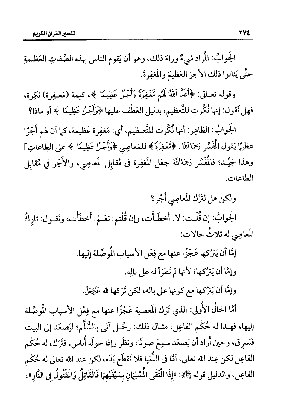 الجَوابُ: الظاهِر: أنها نُكِّرت للتَّعظيم، أي: مَغفِرة عَظيمة، كما أن لهم أَجْرًا عظيمًا يَقول المُفَسِّر رَحِمَهُ اللَّهُ: {مَغْفِرَةً} للمَعاصِي {وَأَجْرًا عَظِيمًا} على الطاعاتِ] وهذا جَيِّد؛ فالمُفَسِّر رَحِمَهُ اللَّهُ جعَل المَغفِرة في مُقابِل المَعاصِي، والأَجْر في مُقابِل الطاعات.