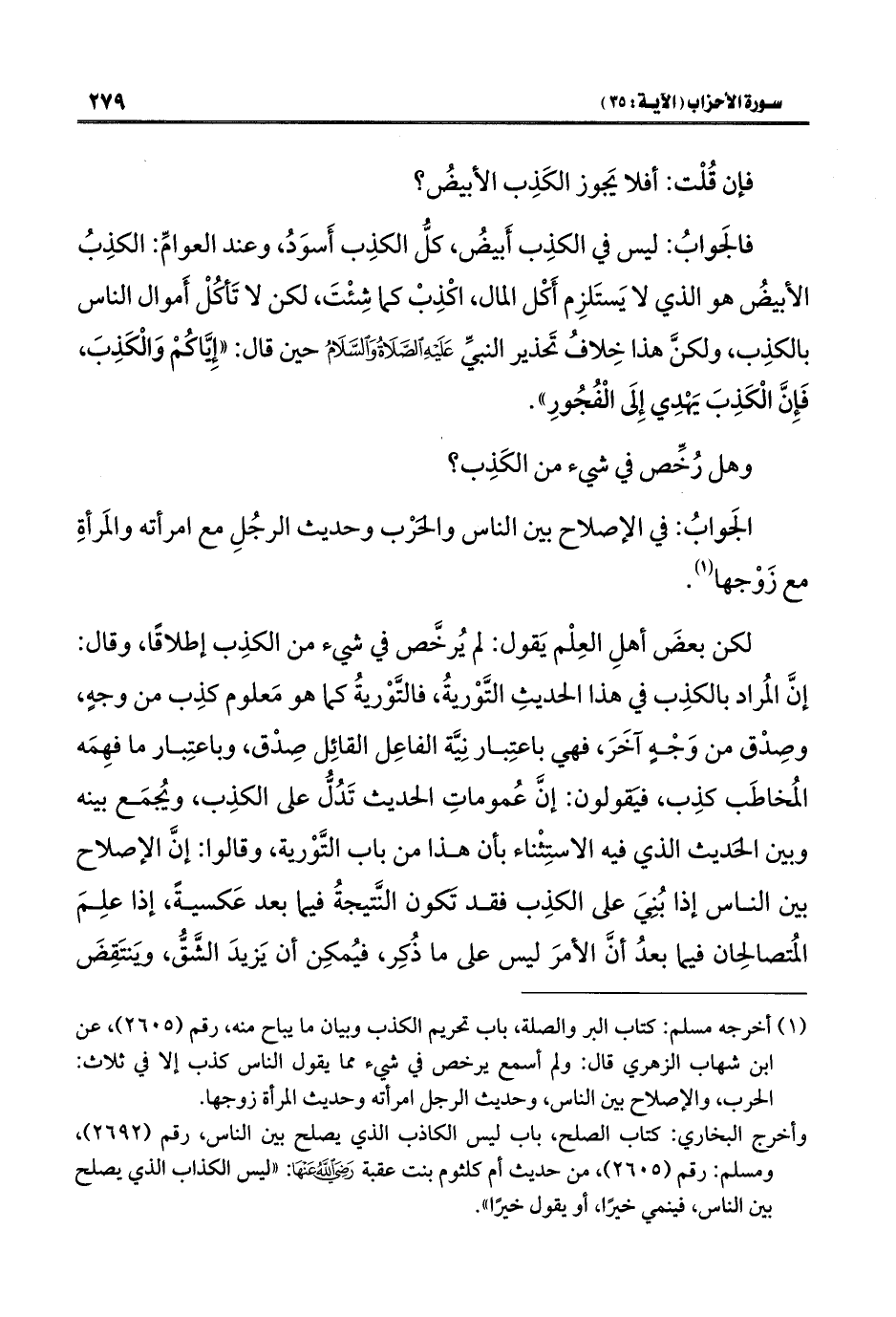 لكن بعضَ أهلِ العِلْم يَقول: لم يُرخَّص في شيء من الكذِب إطلاقًا، وقال: إنَّ المُراد بالكذِب في هذا الحديثِ التَّوْريةُ، فالتَّوْريةُ كما هو مَعلوم كذِب من وجهٍ، وصِدْق من وَجْهٍ آخَرَ، فهي باعتِبار نِيَّة الفاعِل القائِل صِدْق، وباعتِبار ما فهِمَه المُخاطَب كذِب، فيَقولون: إنَّ عُموماتِ الحديث تَدُلُّ على الكذِب، ويُجمَع بينه وبين الحديث الذي فيه الاستِثْناء بأن هذا من باب التَّوْرية، وقالوا: إنَّ الإصلاح بين الناس إذا بُنِيَ على الكذِب فقد تَكون النَّتيجةُ فيما بعد عَكسيةً، إذا علِمَ المُتصالحِان فيما بعدُ أنَّ الأمرَ ليس على ما ذُكِر، فيُمكِن أن يَزيدَ الشَّقُّ، ويَنتَقِضَ