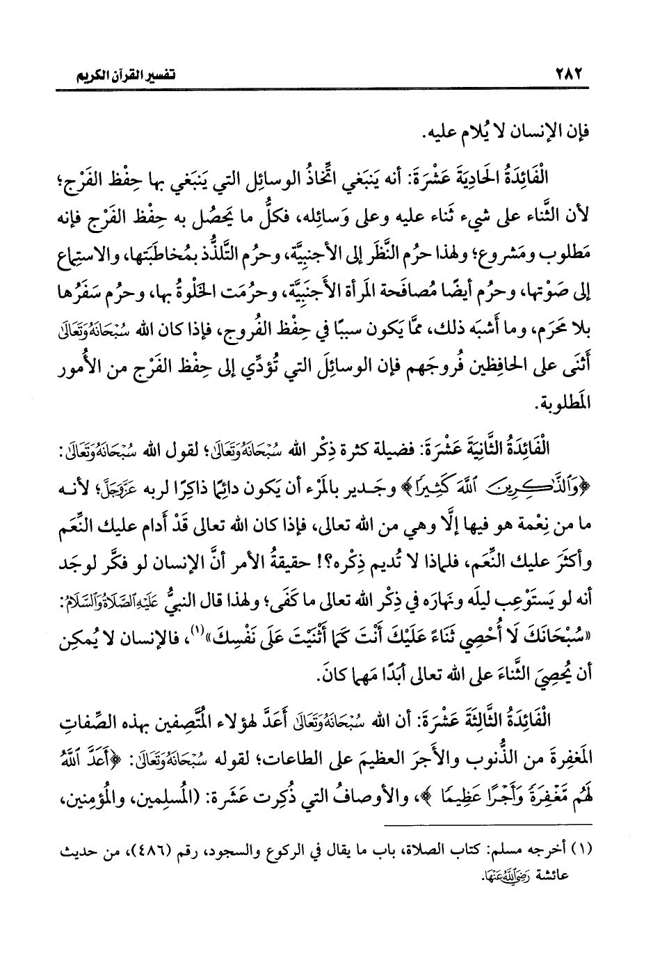 الْفَائِدَةُ الحَادِيَةَ عَشْرَةَ: أنه يَنبَغي اتِّخاذُ الوسائِل التي يَنبَغي بها حِفْظ الفَرْج؛ لأن الثَّناء على شيء ثَناء عليه وعلى وَسائِله، فكل ما يَحصُل به حِفْظ الفَرْج فإنه مَطلوب ومَشروع؛ ولهذا حرُم النَّظَر إلى الأجنبِيَّة، وحرُم التَّلذُّذ بمُخاطَبَتها، والاستِماع إلى صَوْتها، وحرُم أيضًا مُصافَحة المَرأة الأَجنَبِيَّة، وحرُمَت الخَلْوةُ بها، وحرُم سَفَرُها بلا محَرَم، وما أَشبَه ذلك، مِمَّا يَكون سببًا في حِفْظ الفُروج، فإذا كان اللَّه سُبْحَانَهُ وَتَعَالَى أَثنَى على الحافِظين فُروجَهم فإن الوسائِلَ التي تُؤدِّي إلى حِفْظ الفَرْج من الأُمور المَطلوبة.