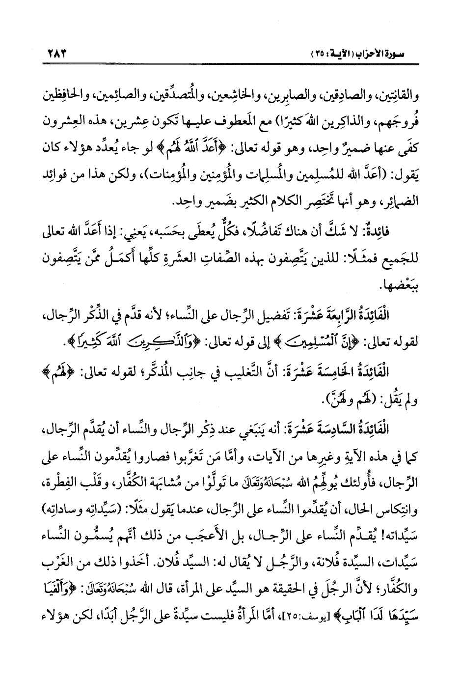 الْفَائِدَةُ الرَّابِعَةَ عَشْرَةَ: تَفضيل الرِّجال على النِّساء؛ لأنه قدَّم في الذِّكْر الرِّجال، لقوله تعالى: {إِنَّ الْمُسْلِمِينَ} إلى قوله تعالى: {وَالذَّاكِرِينَ اللَّهَ كَثِيرًا}.