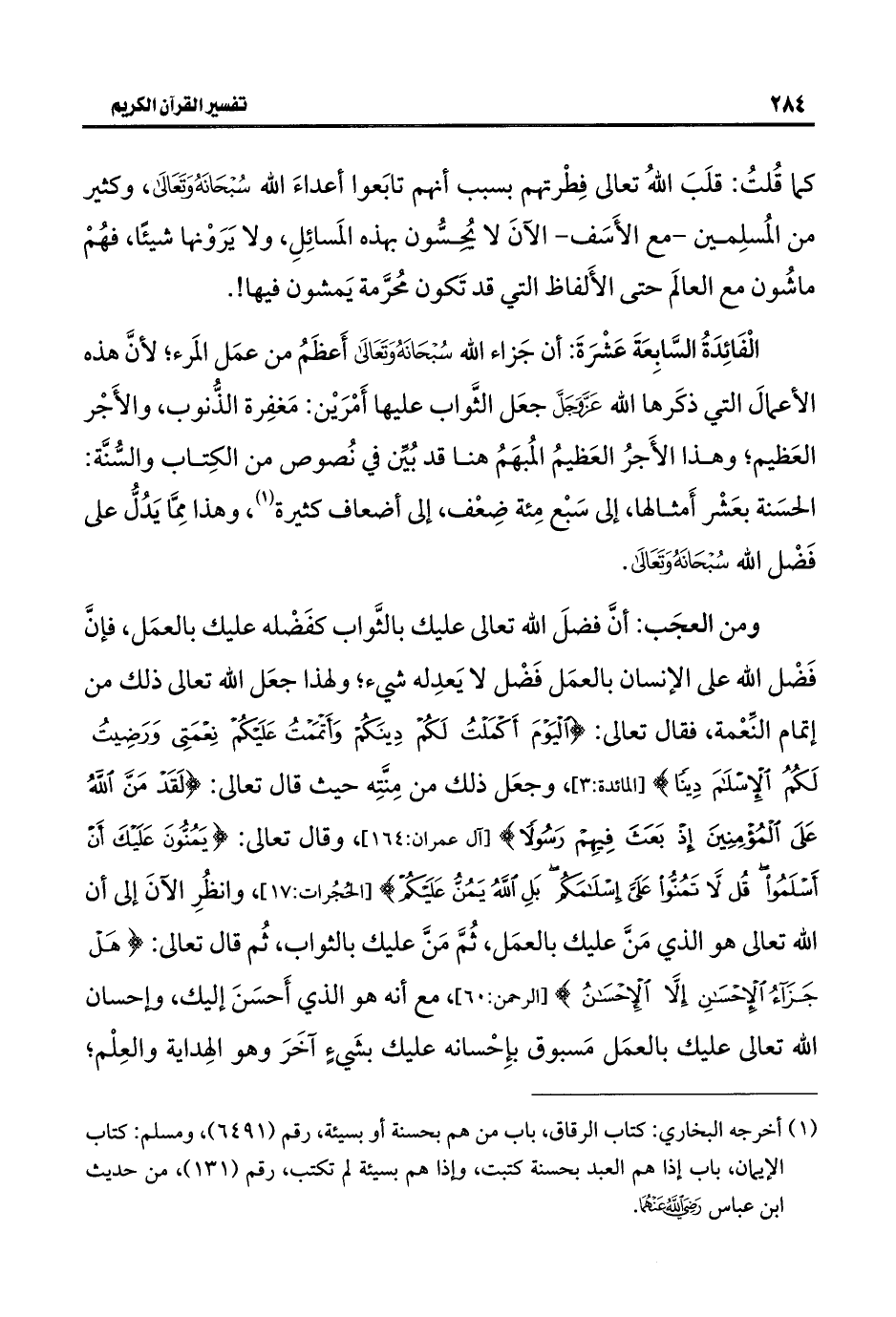 ومن العجَب: أنَّ فضلَ اللَّه تعالى عليك بالثَّواب كفَضْله عليك بالعمَل، فإنَّ فَضْل اللَّه على الإنسان بالعمَل فَضْل لا يَعدِله شيء، ولهذا جعَل اللَّه تعالى ذلك من إتمام النِّعْمة، فقال تعالى: {الْيَوْمَ أَكْمَلْتُ لَكُمْ دِينَكُمْ وَأَتْمَمْتُ عَلَيْكُمْ نِعْمَتِي وَرَضِيتُ لَكُمُ الْإِسْلَامَ دِينًا} [المائدة: ٣]، وجعَل ذلك من مِنَّتِه حيث قال تعالى: {لَقَدْ مَنَّ اللَّهُ عَلَى الْمُؤْمِنِينَ إِذْ بَعَثَ فِيهِمْ رَسُولًا} [آل عمران: ١٦٤]، وقال تعالى: {يَمُنُّونَ عَلَيْكَ أَنْ أَسْلَمُوا قُلْ لَا تَمُنُّوا عَلَيَّ إِسْلَامَكُمْ بَلِ اللَّهُ يَمُنُّ عَلَيْكُمْ} [الحجرات: ١٧]، وانظُرِ الآنَ إلى أن اللَّه تعالى هو الذي مَنَّ عليك بالعمَل، ثُمَّ مَنَّ عليك بالثواب، ثُم قال تعالى: {هَلْ جَزَاءُ الْإِحْسَانِ إِلَّا الْإِحْسَانُ} [الرحمن: ٦٠]، مع أنه هو الذي أَحسَنَ إليك، وإحسان اللَّه تعالى عليك بالعمَل مَسبوق بإِحْسانه عليك بشَيءٍ آخَرَ وهو الهِداية والعِلْم؛