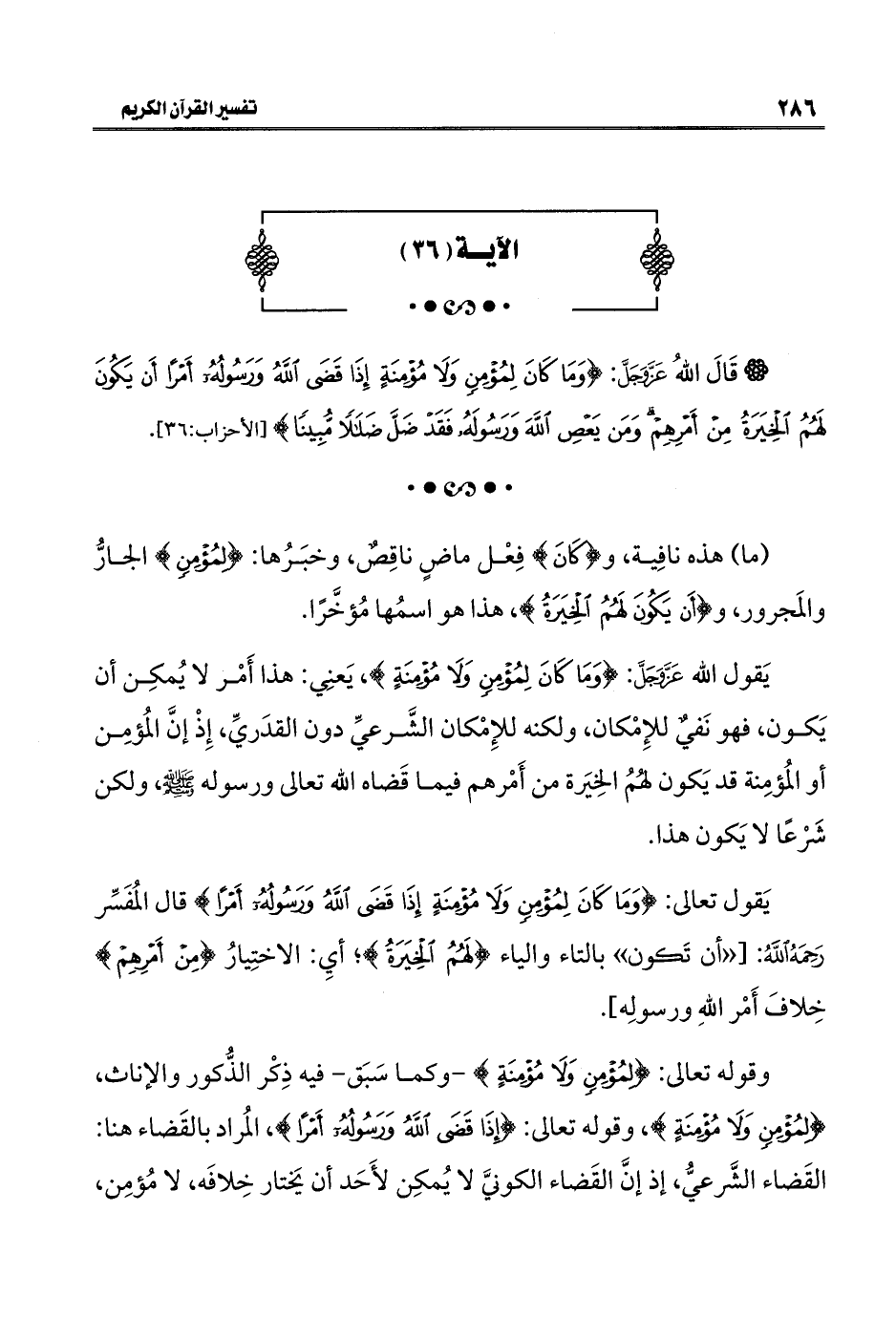 يَقول تعالى: {وَمَا كَانَ لِمُؤْمِنٍ وَلَا مُؤْمِنَةٍ إِذَا قَضَى اللَّهُ وَرَسُولُهُ أَمْرًا} قال المُفَسِّر رَحِمَهُ اللَّهُ: ["أن تَكون" بالتاء والياء {لَهُمُ الْخِيَرَةُ}؛ أي: الاختِيارُ {مِنْ أَمْرِهِمْ} خِلافَ أَمْر اللَّهِ ورسولِه].