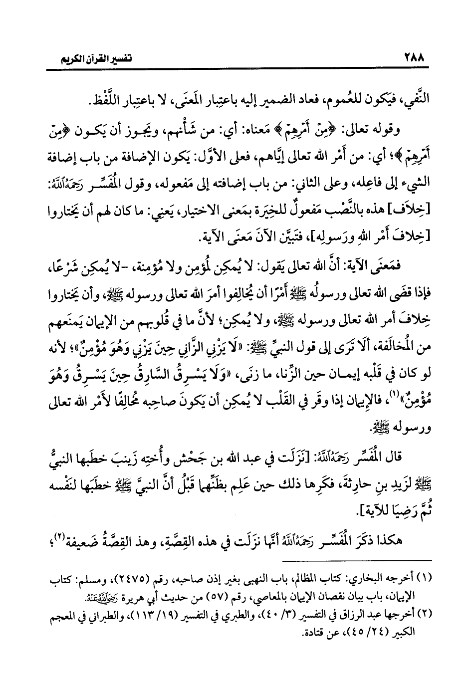 فمَعنَى الآية: أنَّ اللَّه تعالى يَقول: لا يُمكِن لمُؤمِن ولا مُؤمِنة، -لا يُمكِن شَرْعًا، فإذا قضَى اللَّه تعالى ورسولُه -صلى اللَّه عليه وسلم- أَمْرًا أن يُخالِفوا أمرَ اللَّه تعالى ورسوله -صلى اللَّه عليه وسلم-، وأن يَختاروا خِلافَ أمر اللَّه تعالى ورسوله -صلى اللَّه عليه وسلم-، ولا يُمكِن؛ لأنَّ ما في قُلوبهم من الإيمان يَمنَعهم من المُخالَفة، ألَا ترَى إلى قول النبيِّ -صلى اللَّه عليه وسلم-: "لَا يَزْنِي الزَّانِي حِينَ يَزْنى وَهُوَ مُؤْمِنٌ"؛ لأنه لو كان في قَلْبه إيمان حين الزِّنا، ما زنَى، "وَلَا يَسْرِقُ السَّارِقُ حِينَ يَسْرِقُ وَهُوَ مُؤْمِنٌ" (¬١)، فالإِيمان إذا وقَر في القَلْب لا يُمكِن أن يَكونَ صاحِبه مخُالِفًا لأَمْر اللَّه تعالى ورسوله -صلى اللَّه عليه وسلم-.