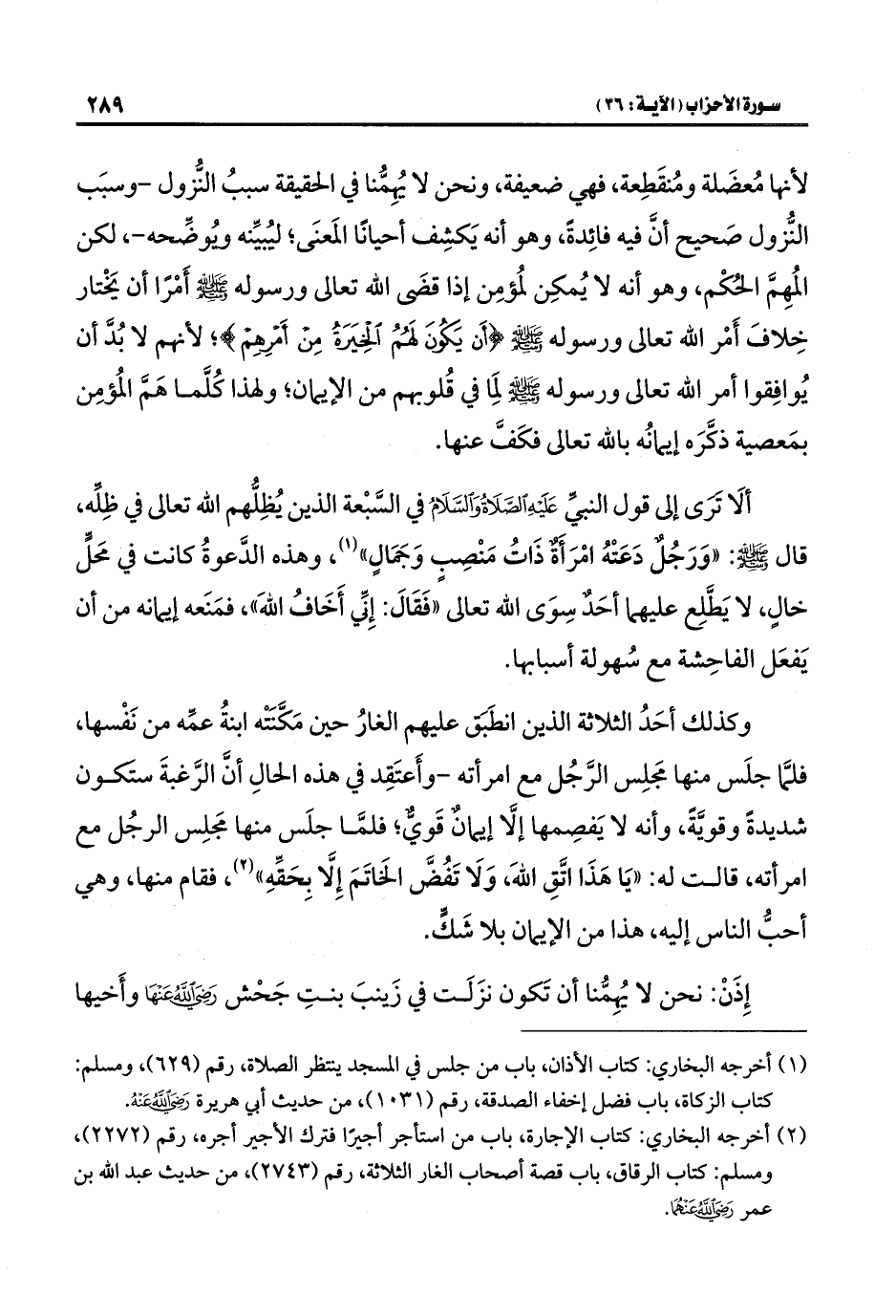 لأنها مُعضَلة ومُنقَطِعة، فهي ضعيفة، ونحن لا يُهِمُّنا في الحقيقة سببُ النُّزول -وسبَب النُّزول صَحيح أنَّ فيه فائِدةً، وهو أنه يَكشِف أحيانًا المَعنَى؛ ليُبيِّنه ويُوضِّحه-، لكن المُهِمَّ الحُكْم، وهو أنه لا يُمكِن لمُؤمِن إذا قضَى اللَّه تعالى ورسوله -صلى اللَّه عليه وسلم- أَمْرًا أن يَخْتار خِلافَ أَمْر اللَّه تعالى ورسوله -صلى اللَّه عليه وسلم- {أَنْ يَكُونَ لَهُمُ الْخِيَرَةُ مِنْ أَمْرِهِمْ}؛ لأنهم لا بُدَّ أن يُوافِقوا أمر اللَّه تعالى ورسوله -صلى اللَّه عليه وسلم- لمِا في قُلوبهم من الإيمان؛ ولهذا كُلَّما هَمَّ المُؤمِن بمَعصية ذكَّرَه إيمانُه باللَّه تعالى فكَفَّ عنها.