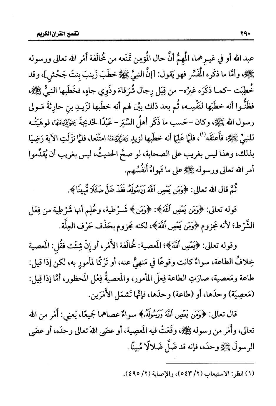 عبد اللَّه أو في غيرِهما، المُهِمُّ أنَّ حال المُؤمِن تمَنَعه من مخُالَفة أَمْر اللَّه تعالى ورسوله -صلى اللَّه عليه وسلم-، وأمَّا ما ذكَره المُفَسِّر فهو يَقول: [إنَّ النبيَّ -صلى اللَّه عليه وسلم- خطَبَ زَينبَ بِنتَ جَحْشٍ]، وقد خُطِبَت -كما ذكَرَه غيرُه- من قِبَل رِجال شُرَفاءَ وذَوِي جاهٍ، فخَطَبها النبيُّ -صلى اللَّه عليه وسلم-، فظَنُّوا أنه خطَبَها لنَفْسِه، ثُم بعد ذلك بيَّن لهم أنه خطَبها لزَيدِ بنِ حارِثةَ مَولى رسول اللَّه -صلى اللَّه عليه وسلم-، وكان- حَسب ما ذَكَر أهلُ السِّيَر- عَبْدًا لخَديجةَ -رضي اللَّه عنها-، فوهَبَتْه للنبيِّ -صلى اللَّه عليه وسلم-، فأَعتَقَه (¬١)، فلمَّا عَلِمَا أنه خطَبها لزيدٍ -رضي اللَّه عنه- امتَنَعا، فلمَّا نزَلَتِ الآية رَضِيَا بذلك، وهذا ليس بغريب على الصحابة، لو صحَّ الحديثُ، ليس بغريب أن يُقدِّموا أمر اللَّه تعالى ورسوله -صلى اللَّه عليه وسلم- على ما تَهواهُ أَنفُسُهم.