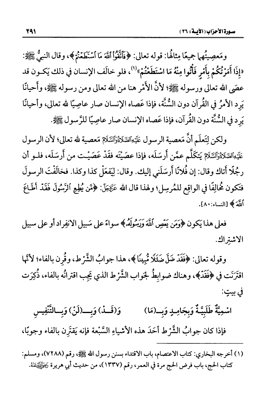 ولكن لِتَعلَم أنَّ مَعصية الرسول عَلَيْهِ الصَّلَاةُ وَالسَّلَامُ مَعصية للَّه تعالى؛ لأن الرسول عَلَيْهِ الصَّلَاةُ وَالسَّلَامُ يَتكَلَّم عمَّن أَرسَلَه، فإذا عصَيْتَه فقَدْ عَصَيْت من أَرسَلَه، فلو أن رجُلًا أَتاك وقال: إن فُلانًا أَرسَلَني إليك. وقال: ليَفعَلْ كذا وكذا. فخالَفْتَ الرسولَ فتكون مخُالِفًا في الواقِع للمُرسِل؛ ولهذا قال اللَّه عَزَّ وَجَلَّ: {مَنْ يُطِعِ الرَّسُولَ فَقَدْ أَطَاعَ اللَّهَ} [النساء: ٨٠].