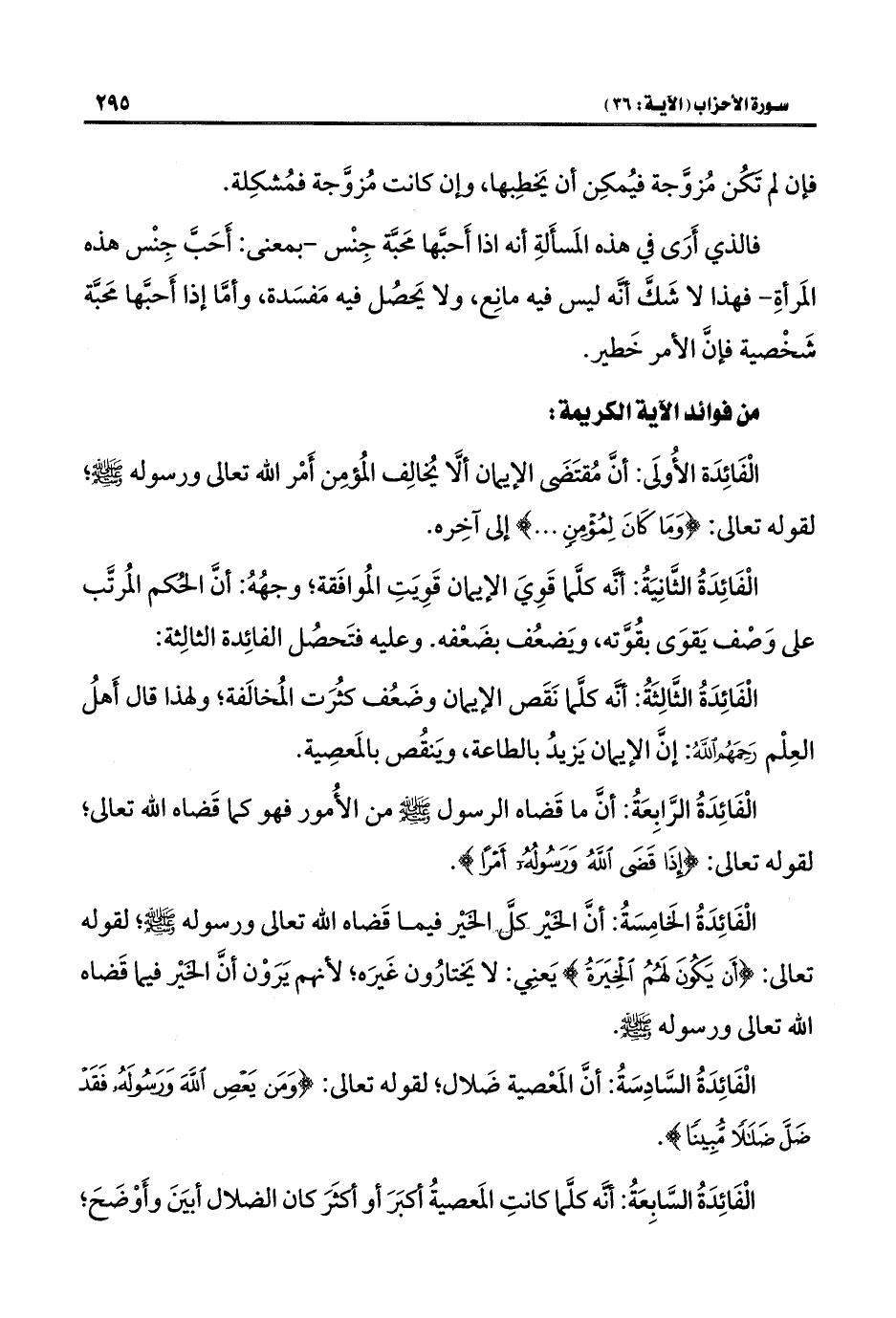 الْفَائِدَة الأُولَى: أنَّ مُقتَضَى الإيمان ألَّا يُخالِف المُؤمِن أَمْر اللَّه تعالى ورسوله -صلى اللَّه عليه وسلم-؛ لقوله تعالى: {وَمَا كَانَ لِمُؤْمِنٍ. . .} إلى آخِره.