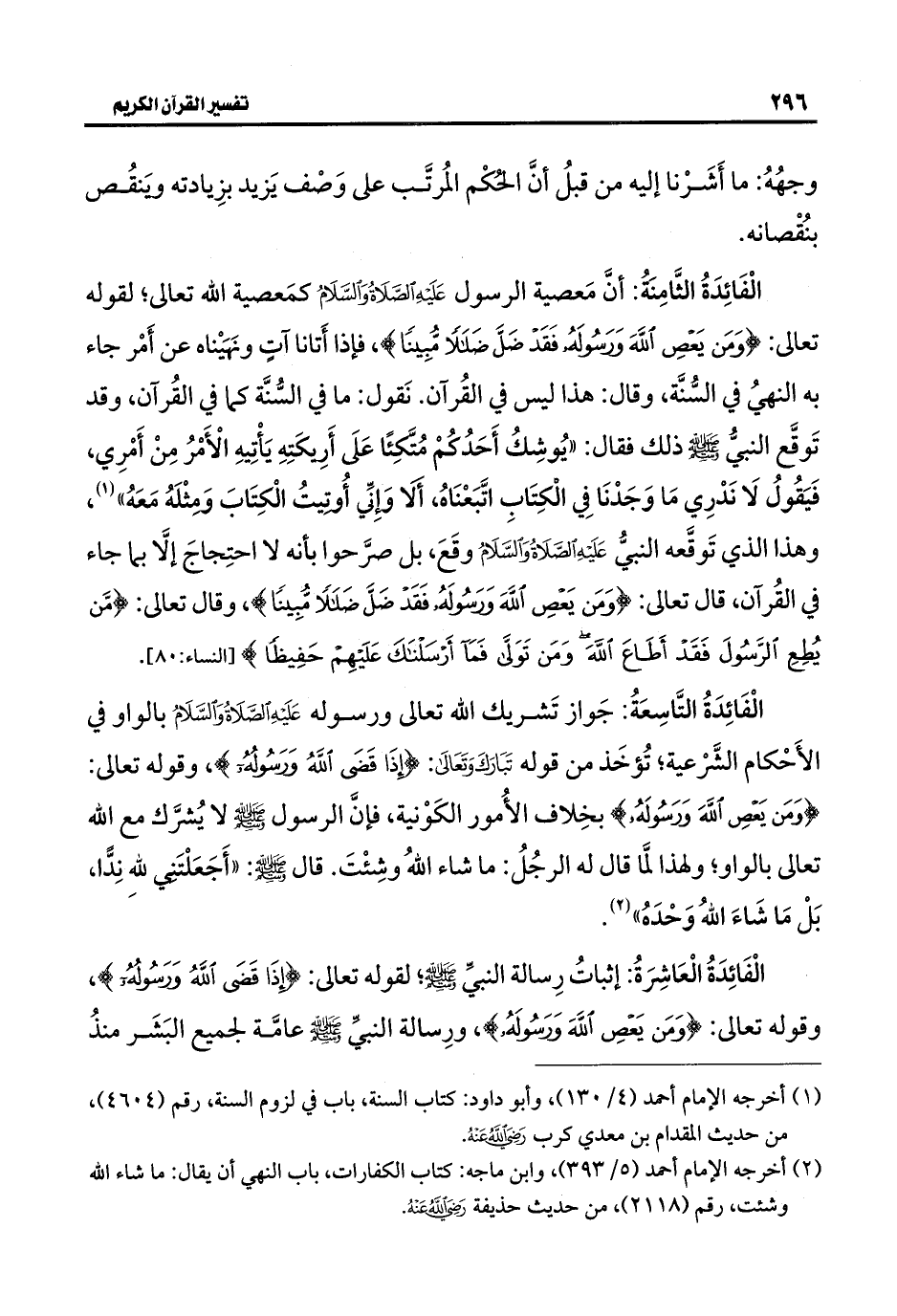 الْفَائِدَةُ الثَّامِنةُ: أنَّ مَعصية الرسول عَلَيْهِ الصَّلَاةُ وَالسَّلامُ كمَعصية اللَّه تعالى؛ لقوله تعالى: {وَمَنْ يَعْصِ اللَّهَ وَرَسُولَهُ فَقَدْ ضَلَّ ضَلَالًا مُبِينًا}، فإذا أَتانا آتٍ ونَهَيْناه عن أَمْر جاء به النهيُ في السُّنَّة، وقال: هذا ليس في القُرآن. نَقول: ما في السُّنَّة كما في القُرآن، وقد تَوقَّع النبيُّ -صلى اللَّه عليه وسلم- ذلك فقال: "يُوشِكُ أَحَدُكُمْ مُتَّكِئًا عَلَى أَرِيكَتِهِ يَأْتِيهِ الْأَمْرُ مِنْ أَمْرِي، فَيَقُوُل لَا نَدْرِي مَا وَجَدْنَا فِي الْكِتَابِ اتَّبَعْنَاهُ، أَلا وَإِنِّي أُؤتيتُ الْكِتَابَ وَمثْلَهُ مَعَهُ" (¬١)،