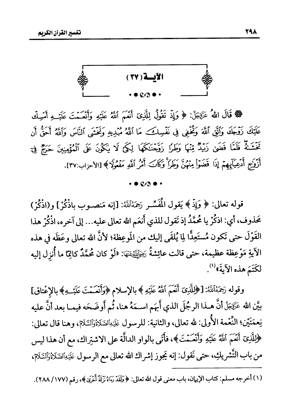 وقوله رَحِمَهُ اللَّهُ: [{لِلَّذِي أَنْعَمَ اللَّهُ عَلَيْهِ} بالإسلام {وَأَنْعَمْتَ عَلَيْهِ} بالإِعْتاق] بيَّن اللَّه عَزَّ وَجَلَّ أنَّ هذا الرجُلَ الذي أَبهَم اسمَهُ هنا، ثُم أَوضَحَه فيما بعد أنَّ عليه نِعمَتَيْن؛ النِّعْمة الأُولى: للَّه تعالى، والثانية: للرسول عَلَيْهِ الصَّلَاةُ وَالسَّلَامُ، وهنا قال تعالى: {لِلَّذِي أَنْعَمَ اللَّهُ عَلَيْهِ وَأَنْعَمْتَ}، فأتَى بالواو الدالَّة على الاشتِراك، مع أن هذا ليس من باب التَّشريكِ، حتى نَقول: إنه يَجوز إشراك اللَّه تعالى مع الرسول عَلَيْهِ الصَّلَاةُ وَالسَّلَامُ،