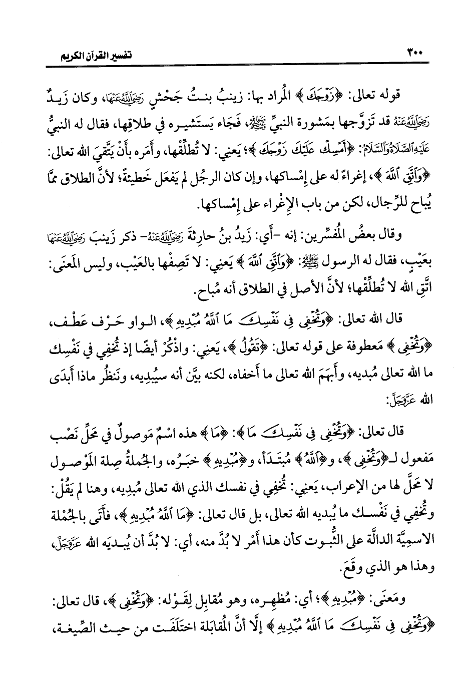قال تعالى: {وَتُخْفِي فِي نَفْسِكَ مَا}: {مَا} هذه اسْمٌ مَوصولٌ في محَلِّ نَصْب مَفعول لـ {وَتُخْفِي}، و {اللَّهُ} مُبتَدَأ، و {مُبْدِيهِ} خبَرُه، والجُملةُ صِلة المَوْصول لا محَلَّ لها من الإعراب، يَعنِي: تُخفِي في نفسك الذي اللَّه تعالى مُبدِيه، وهنا لم يَقُلْ: وتُخفِي في نَفْسك ما يُبديه اللَّه تعالى، بل قال تعالى: {مَا اللَّهُ مُبْدِيهِ}، فأَتَى بالجُمْلة الاسمِيَّة الدالَّة على الثُّبوت كأن هذا أَمْر لا بُدَّ منه، أي: لا بُدَّ أن يُبديَه اللَّه عَزَّ وَجَلَّ، وهذا هو الذي وقَعَ.