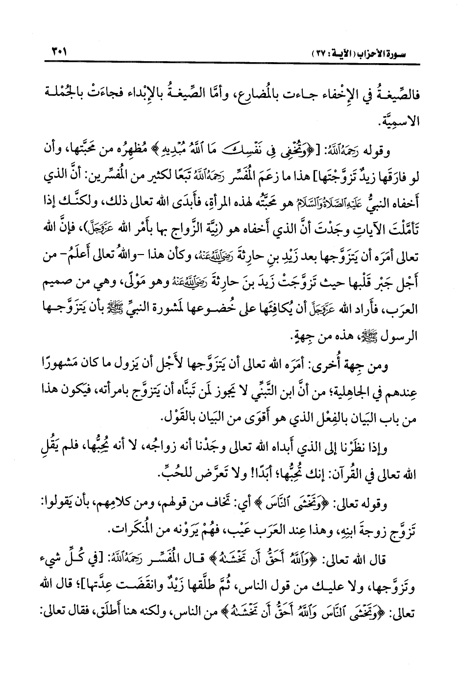 وقوله رَحِمَهُ اللَّهُ: [{وَتُخْفِي فِي نَفْسِكَ مَا اللَّهُ مُبْدِيهِ} مُظهِرُه من مَحبَّتها، وأن لو فارَقَها زيدٌ تَزوَّجْتَها] هذا ما زعَمَ المُفَسِّر رَحِمَهُ اللَّهُ تبَعًا لكثير من المُفسِّرين: أنَّ الذي أَخفاه النبيُّ عَلَيْهِ الصَّلَاةُ وَالسَّلَامُ هو مَحبّتُه لهذه المرأةِ، فأَبدَى اللَّه تعالى ذلك، ولكنَّك إذا تَأمَّلْتَ الآياتِ وجَدْتَ أنَّ الذي أَخفاه هو (نِيَّة الزَّواج بها بأَمْر اللَّه عَزَّ وَجَلَّ)، فإنَّ اللَّه تعالى أمَرَه أن يَتزَوَّجها بعد زيدِ بنِ حارِثةَ -رضي اللَّه عنه-، وكأن هذا -واللَّهُ تعالى أَعلَمُ- من أَجْل جَبْر قَلْبها حيث تَزوَّجَتْ زَيدَ بنَ حارِثةَ -رضي اللَّه عنه- وهو مَوْلًى، وهي من صميم العرَب، فأَراد اللَّه عَزَّ وَجَلَّ أن يُكافِئَها على خُضوعها لمَشورة النبيِّ -صلى اللَّه عليه وسلم- بأن يَتزَوَّجها الرسول -صلى اللَّه عليه وسلم-، هذه من جِهةٍ.