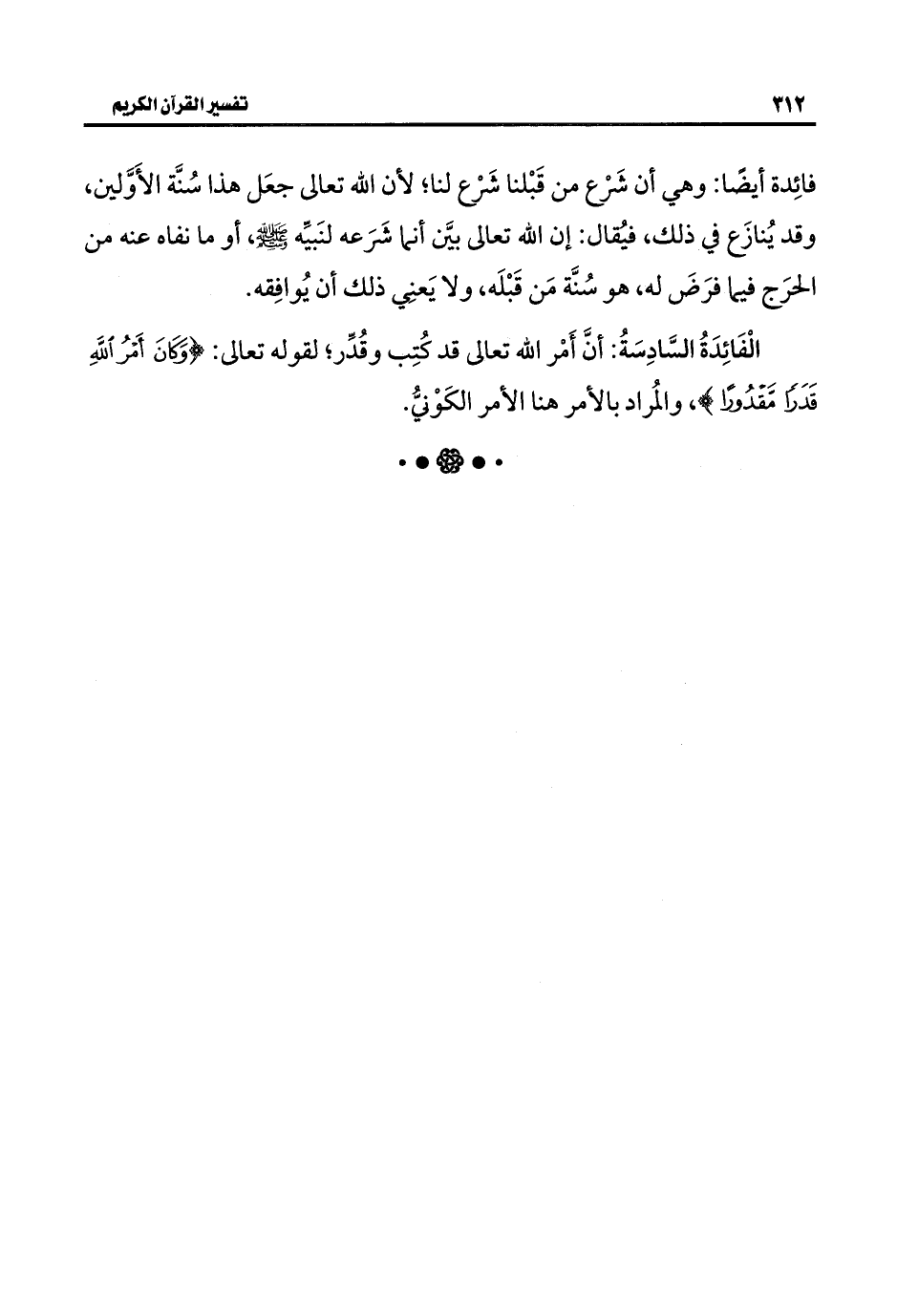 فائِدة أيضًا: وهي أن شَرْع من قَبْلنا شَرْع لنا؛ لأن اللَّه تعالى جعَل هذا سُنَّة الأَوَّلين، وقد يُنازَع في ذلك، فيُقال: إن اللَّه تعالى بيَّن أنما شَرَعه لنَبيِّه -صلى اللَّه عليه وسلم-، أو ما نفاه عنه من الحرَج فيما فرَضَ له، هو سُنَّة مَن قَبْلَه، ولا يَعنِي ذلك أن يُوافِقه.