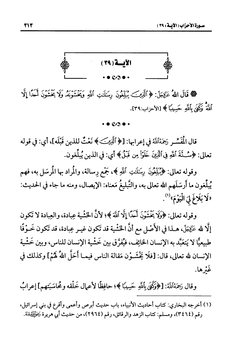 وقوله تعالى: {وَلَا يَخْشَوْنَ أَحَدًا إِلَّا اللَّهَ}؛ لأنَّ الخَشْية عِبادة، والعِبادة لا تَكون إلَّا للَّه عَزَّ وَجَلَّ، هذا في الأَصْل مع أنَّ الخَشْية قد تَكون غير عِبادة، قد تَكون خَوْفًا طبيعيًّا لا يَتعَبَّد به الإنسان الخائِف، فيُفرَّق بين خَشْية الإنسان للناس، وبين خَشْية الإنسان للَّه تعالى، قال: [فلَا يَخْشَوْن مَقالة الناس فيما أَحَلَّ اللَّهُ لَهُمْ] وكذلك في غَيْرها.