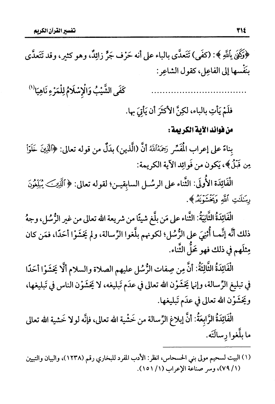 الْفَائِدَةُ الثَّانِيَةُ: الثَّناء على مَن بلَّغ شيئًا من شريعة اللَّه تعالى من غير الرُّسُل، وجهُ ذلك أنَّه إنَّما أُثنِيَ على الرُّسُل؛ لكونهم بلَّغوا الرِّسالة، ولم يَخشَوْا أحَدًا، فمَن كان مِثلَهم في ذلك فهو مَحلُّ الثَّناء.