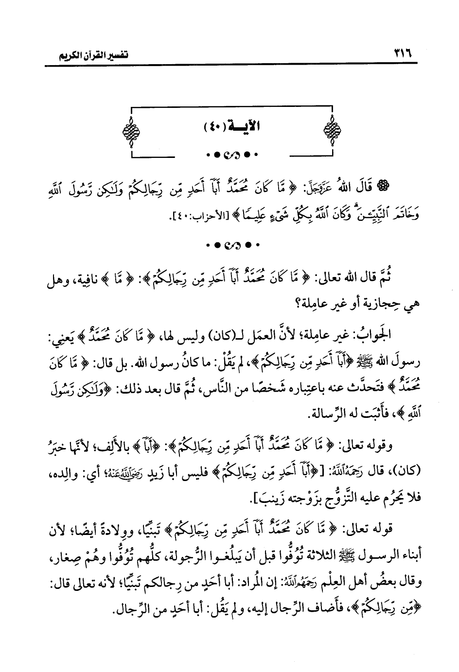وقوله تعالى: {مَا كَانَ مُحَمَّدٌ أَبَا أَحَدٍ مِنْ رِجَالِكُمْ}: {أَبَا} بالأَلِف؛ لأنَّها خبَرُ (كان)، قال رَحِمَهُ اللَّهُ: [{أَبَا أَحَدٍ مِنْ رِجَالِكُمْ} فليس أبا زَيدٍ -رضي اللَّه عنه-؛ أي: والِده، فلا يَحرُم عليه التَّزوُّج بزَوْجته زَينبَ].