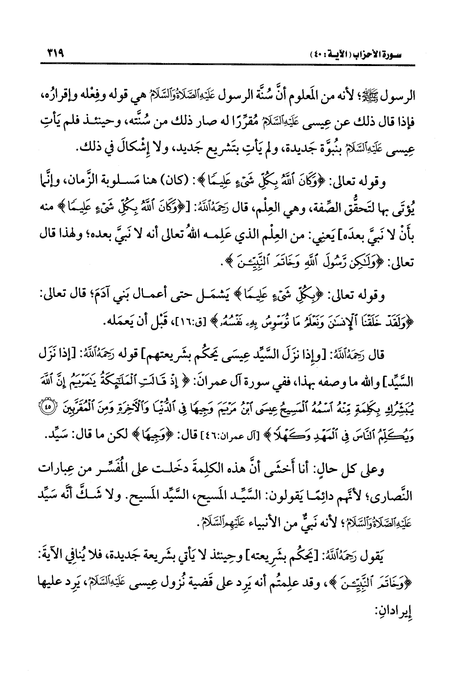وقوله تعالى: {وَكَانَ اللَّهُ بِكُلِّ شَيْءٍ عَلِيمًا}: (كان) هنا مَسلوبة الزَّمان، وإنَّما يُؤتَى بها لتَحقُّق الصِّفة، وهي العِلْم، قال رَحِمَهُ اللَّهُ: [{وَكَانَ اللَّهُ بِكُلِّ شَيْءٍ عَلِيمًا} منه بأَنْ لا نَبيَّ بعدَه] يَعنِي: من العِلْم الذي عَلِمه اللَّهُ تعالى أنه لا نَبيَّ بعده؛ ولهذا قال تعالى: {وَلَكِنْ رَسُولَ اللَّهِ وَخَاتَمَ النَّبِيِّينَ}.