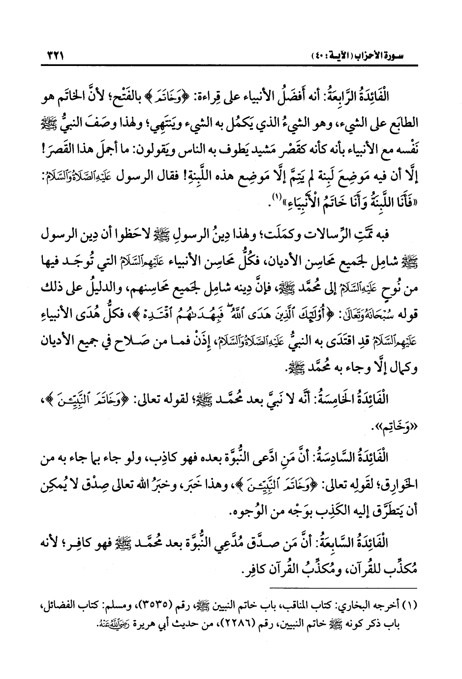 الْفَائِدَةُ الرَّابِعَةُ: أنه أَفضَلُ الأنبياء على قِراءة: {وَخَاتَمَ} بالفَتْح؛ لأنَّ الخاتَم هو الطابَع على الشيء، وهو الشيءُ الذي يَكمُل به الشيء ويَنتَهِي؛ ولهذا وصَفَ النبيُّ -صلى اللَّه عليه وسلم- نَفْسه مع الأنبياء بأنه كأنه كقَصْر مَشيد يَطوف به الناس ويَقولون: ما أجملَ هذا القَصرَ! إلَّا أن فيه مَوضِعَ لَبِنة لم يَتِمَّ إلَّا مَوضِع هذه اللَّبِنةِ! فقال الرسول عَلَيْهِ الصَّلَاةُ وَالسَّلَامُ: "فَأَنَا اللَّبِنَةُ وَأَنَا خَاتَمُ الْأَنبِيَاءِ" (¬١).