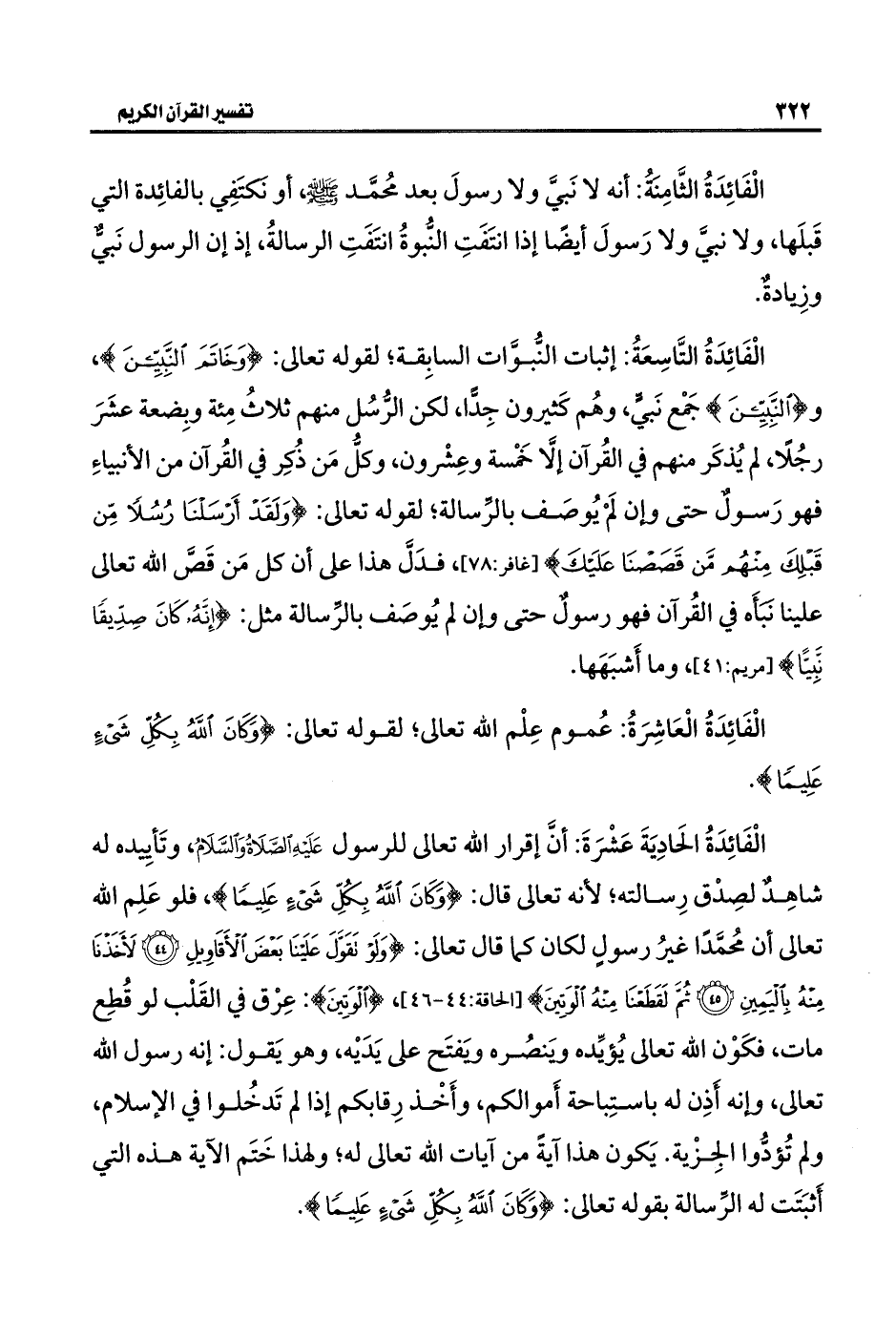 الْفَائِدَةُ التَّاسِعَةُ: إثبات النُّبوَّات السابِقة؛ لقوله تعالى: {وَخَاتَمَ النَّبِيِّينَ}، و {النَّبِيِّينَ} جَمْع نَبيٍّ، وهُم كَثيرون جِدًّا، لكن الرُّسُل منهم ثلاثُ مِئة وبِضعة عشَرَ رجُلًا، لم يُذكَر منهم في القُرآن إلا خَمْسة وعِشْرون، وكلُّ مَن ذُكِر في القُرآن من الأنبياءِ فهو رَسولٌ حتى وإن لَمْ يُوصَف بالرسالة؛ لقوله تعالى: {وَلَقَدْ أَرْسَلْنَا رُسُلًا مِنْ قَبْلِكَ مِنْهُمْ مَنْ قَصَصْنَا عَلَيْكَ} [غافر: ٧٨]، فدَل هذا على أن كل مَن قَصَّ اللَّه تعالى علينا نَبَأَه في القُرآن فهو رسولٌ حتى وإن لم يُوصَف بالرِّسالة مثل: {إِنَّهُ كَانَ صِدِّيقًا نَبِيًّا} [مريم: ٤١]، وما أَشبَهَها.