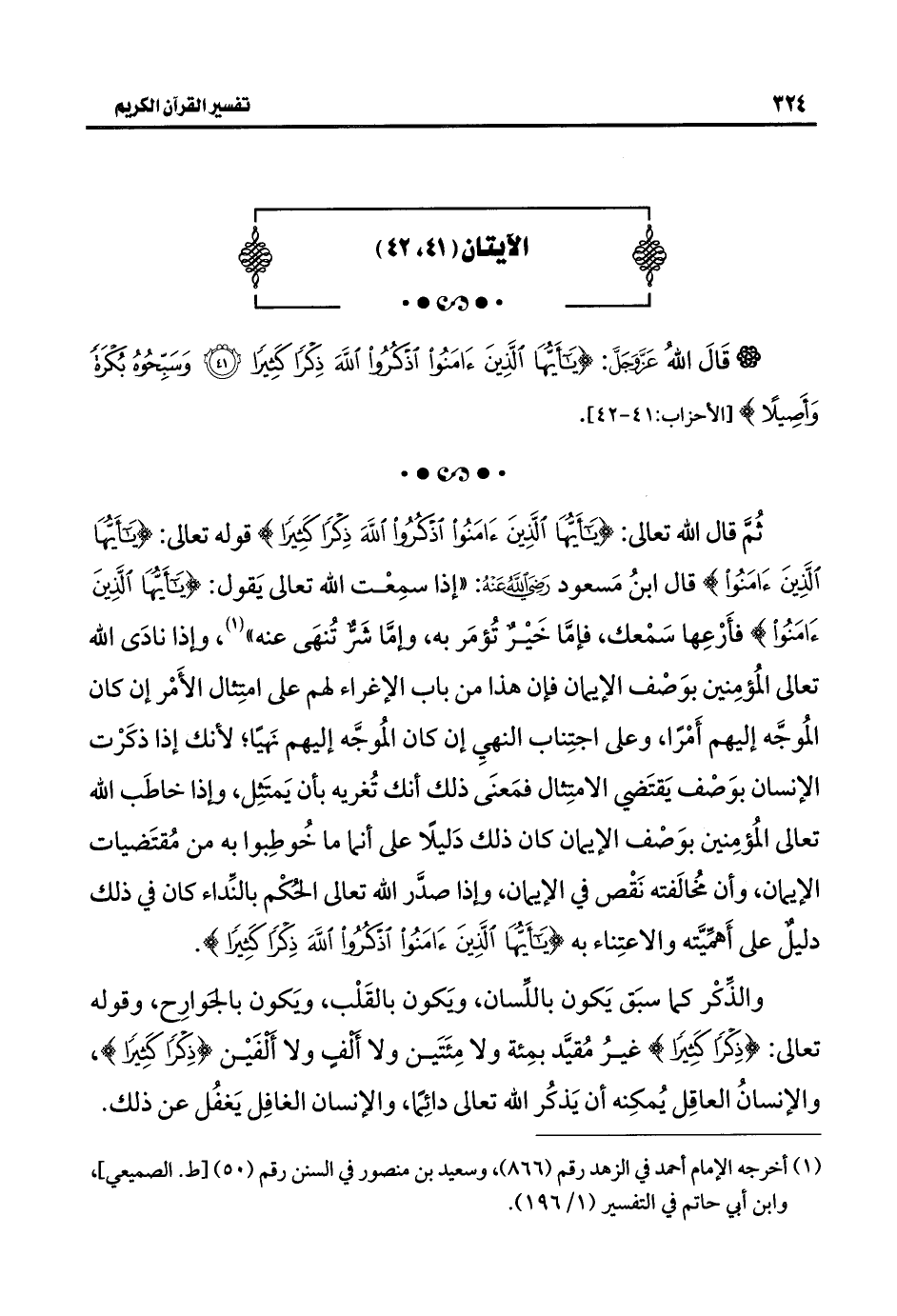 ثُمَّ قال اللَّه تعالى: {يَاأَيُّهَا الَّذِينَ آمَنُوا اذْكُرُوا اللَّهَ ذِكْرًا كَثِيرًا} قوله تعالى: {يَاأَيُّهَا الَّذِينَ آمَنُوا} قال ابنُ مَسعود -رضي اللَّه عنه-: "إذا سمِعْت اللَّه تعالى يَقول: {يَاأَيُّهَا الَّذِينَ آمَنُوا} فأَرْعِها سَمْعك، فإمَّا خَيْرٌ تُؤمَر به، وإمَّا شَرٌّ تُنهَى عنه" (¬١)، وإذا نادَى اللَّه تعالى المُؤمِنين بوَصْف الإيمان فإن هذا من باب الإغراء لهم على امتِثال الأَمْر إن كان المُوجَّه إليهم أَمْرًا، وعلى اجتِناب النهي إن كان المُوجَّه إليهم نَهيًا؛ لأنك إذا ذكَرْت الإنسان بوَصْف يَقتَضي الامتِثال فمَعنَى ذلك أنك تُغريه بأن يَمتَثِل، وإذا خاطَب اللَّه تعالى المُؤمِنين بوَصْف الإيمان كان ذلك دَليلًا على أنما ما خُوطِبوا به من مُقتَضيات الإيمان، وأن مُخالَفته نَقْص في الإيمان، وإذا صدَّر اللَّه تعالى الحُكْم بالنِّداء كان في ذلك دليلٌ على أَهمِّيَّته والاعتِناء به {يَاأَيُّهَا الَّذِينَ آمَنُوا اذْكُرُوا اللَّهَ ذِكْرًا كَثِيرًا}.