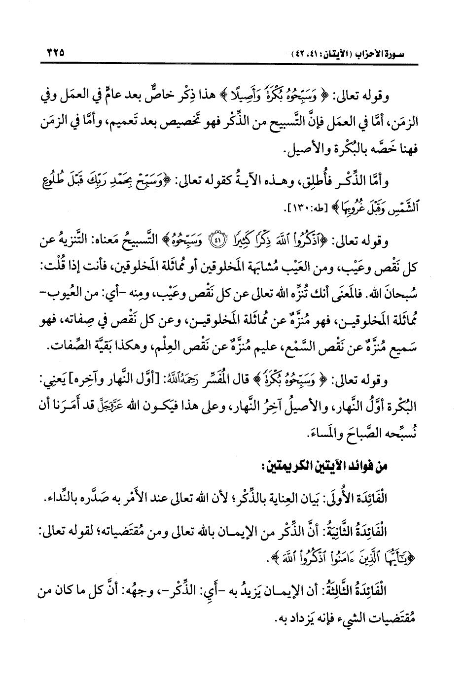 وقوله تعالى: {اذْكُرُوا اللَّهَ ذِكْرًا كَثِيرًا (٤١) وَسَبِّحُوهُ} التَّسبيحُ مَعناه: التَّنزيهُ عن كل نَقْص وعَيْب، ومن العَيْب مُشابَهة المَخلوقين أو مُماثَلة المَخلوقين، فأنت إذا قُلْت: سُبحانَ اللَّه. فالمَعنَى أنك تُنزِّه اللَّه تعالى عن كل نَقْص وعَيْب، ومنه -أي: من العُيوب- مُماثَلة المَخلوقين، فهو مُنزَّهٌ عن مُماثَلة المَخلوقين، وعن كل نَقْص في صِفاته، فهو سَميع مُنزَّهٌ عن نَقْص السَّمْع، عليم مُنزَّهٌ عن نَقْص العِلْم، وهكذا بَقيَّة الصِّفات.