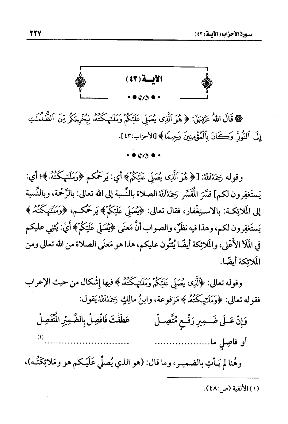 وقوله تعالى: {الَّذِي يُصَلِّي عَلَيْكُمْ وَمَلَائِكَتُهُ} فيها إِشْكال من حيث الإعراب فقوله تعالى: {وَمَلَائِكَتُهُ} مَرفوعة، وابنُ مالِكٍ رَحِمَهُ اللَّهُ يَقول: