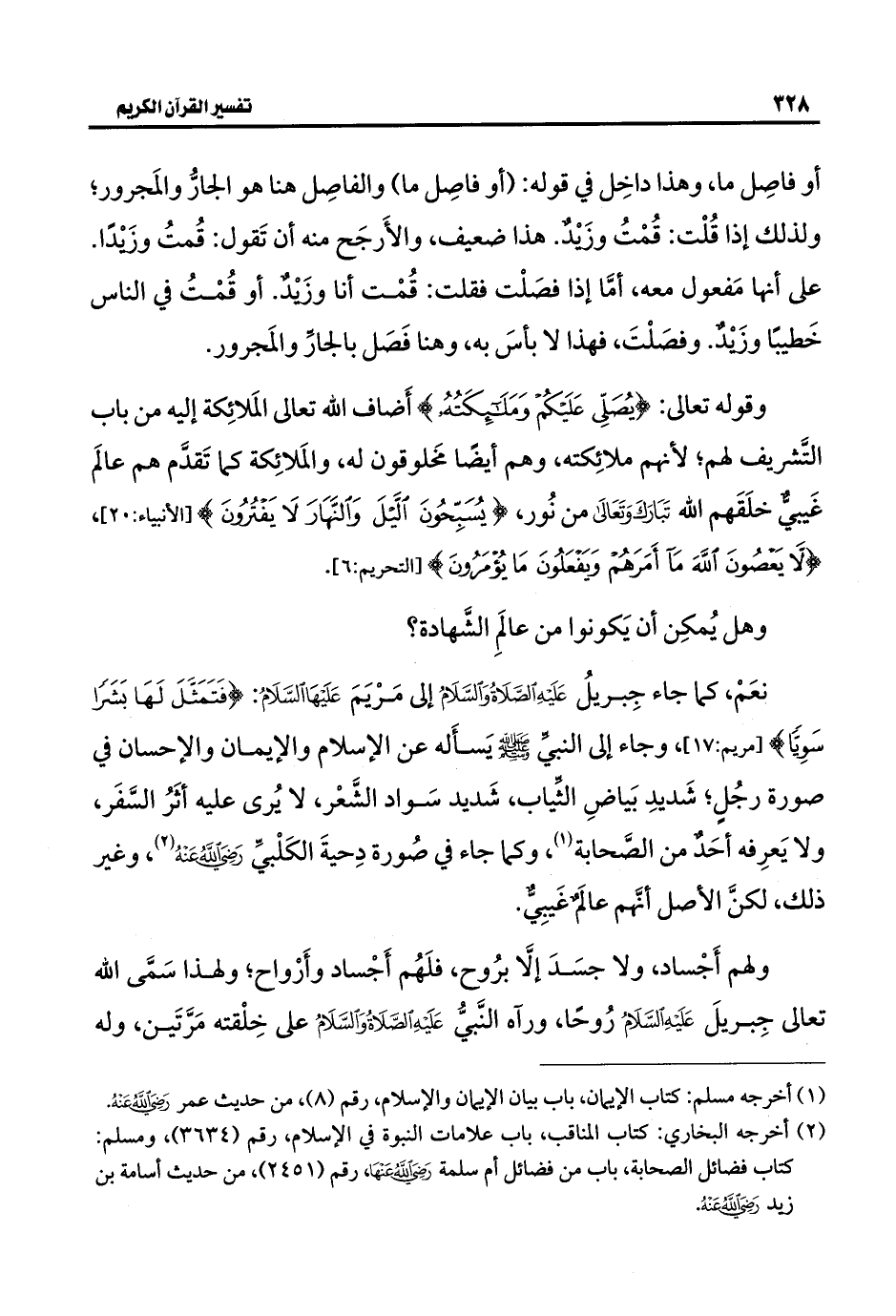 ولهم أَجْساد، ولا جسَدَ إلَّا برُوح، فلَهُم أَجْساد وأَرْواح؛ ولهذا سَمَّى اللَّه تعالى جِبريلَ عَلَيْهِ السَّلَامُ رُوحًا، ورآه النَّبيُّ عَلَيْهِ الصَّلَاةُ وَالسَّلَامُ على خِلْقته مَرَّتَين، وله