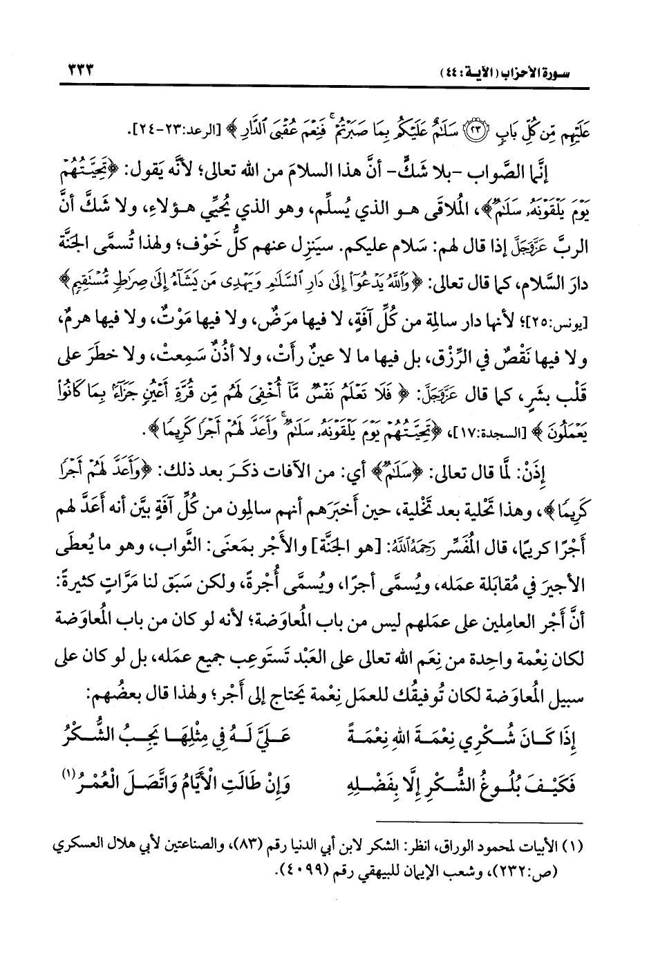 إنَّما الصَّواب -بلا شَكٍّ- أنَّ هذا السلامَ من اللَّه تعالى؛ لأَنَّه يَقول: {تَحِيَّتُهُمْ يَوْمَ يَلْقَوْنَهُ سَلَامٌ}، المُلاقَى هو الذي يُسلِّم، وهو الذي يُحيِّي هؤلاءِ، ولا شَكَّ أنَّ الربَّ عَزَّ وَجَلَّ إذا قال لهم: سَلام عليكم. سيَنزِل عنهم كلُّ خَوْف؛ ولهذا تُسمَّى الجَنَّة دارَ السَّلام، كما قال تعالى: {وَاللَّهُ يَدْعُو إِلَى دَارِ السَّلَامِ وَيَهْدِي مَنْ يَشَاءُ إِلَى صِرَاطٍ مُسْتَقِيمٍ} [يونس: ٢٥]؛ لأنها دار سالمِة من كُلِّ آفَةٍ، لا فيها مرَضٌ، ولا فيها مَوْتٌ، ولا فيها هرمٌ، ولا فيها نَقْصٌ في الرِّزْق، بل فيها ما لا عينٌ رأَتْ، ولا أذُنٌ سَمِعتْ، ولا خطَرَ على قَلْب بشَرٍ، كما قال عَزَّ وَجَلَّ: {فَلَا تَعْلَمُ نَفْسٌ مَا أُخْفِيَ لَهُمْ مِنْ قُرَّةِ أَعْيُنٍ جَزَاءً بِمَا كَانُوا يَعْمَلُونَ} [السجدة: ١٧]، {تَحِيَّتُهُمْ يَوْمَ يَلْقَوْنَهُ سَلَامٌ وَأَعَدَّ لَهُمْ أَجْرًا كَرِيمًا}.