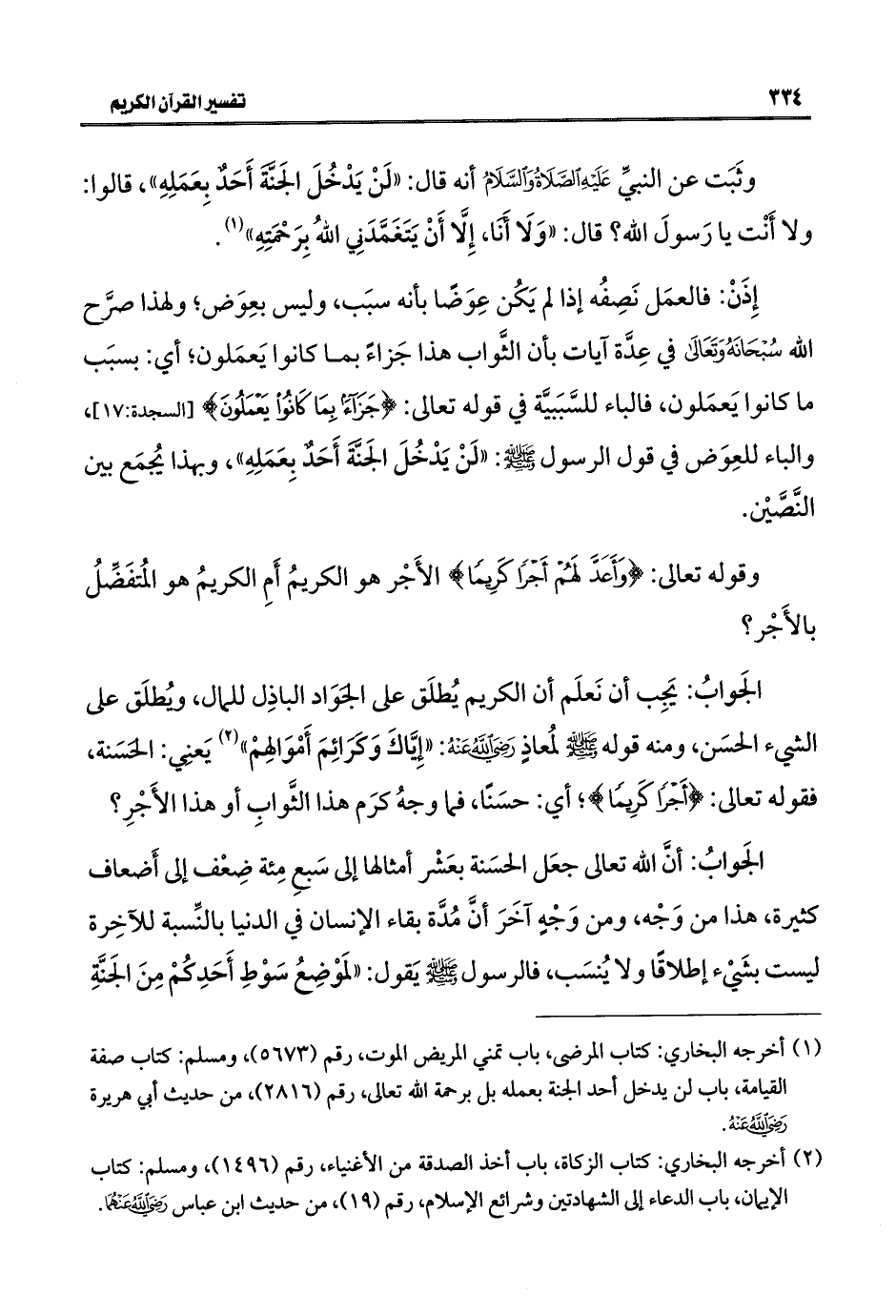 إِذَنْ: فالعمَل نَصِفُه إذا لم يَكُن عِوَضًا بأنه سبَب، وليس بعِوَض؛ ولهذا صرَّح اللَّه سُبْحَانَهُ وَتَعَالَى في عِدَّة آيات بأن الثَّواب هذا جَزاءً بما كانوا يَعمَلون؛ أي: بسبَب ما كانوا يَعمَلون، فالباء للسَّبَبيَّة في قوله تعالى: {جَزَاءً بِمَا كَانُوا يَعْمَلُونَ} [السجدة: ١٧]، والباء للعِوَض في قول الرسول -صلى اللَّه عليه وسلم-: "لَنْ يَدْخُلَ الجَنَّةَ أَحَدٌ بِعَمَلِهِ"، وبهذا يُجمَع بين النَّصَّيْن.