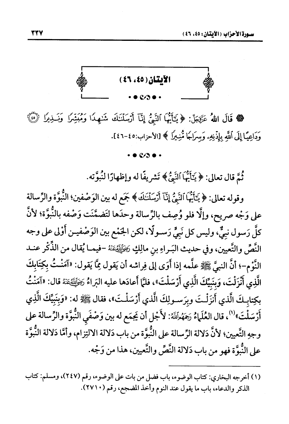 وقوله تعالى: {يَاأَيُّهَا النَّبِيُّ إِنَّا أَرْسَلْنَاكَ} جَمَع له بين الوَصْفين؛ النُّبوَّة والرِّسالة على وَجْه صريح، وإلَّا فلو وُصِف بالرِّسالة وحدَها لتَضمَّنَت وَصْفه بالنُّبوَّة؛ لأنَّ كلَّ رَسول نبِيٌّ، وليس كل نَبِيٍّ رَسولًا، لكن الجمْع بين الوَصْفين أَوْلى على وجه النَّصِّ والتَّعيين، وفي حديث البَراءِ بنِ مالِكٍ -رضي اللَّه عنه- يُقال من الذِّكْر عند النَّوْم-؛ أنَّ النبيَّ -صلى اللَّه عليه وسلم- علَّمه إذا أَوَى إلى فِراشه أن يَقول مِمَّا يَقول: "آمَنْتُ بِكِتَابِكَ الَّذِي أنزَلْتَ، وَبِنَبِيِّكَ الَّذِي أَرْسَلْتَ"، فلمَّا أَعادَها عليه البَراءُ -رضي اللَّه عنه- قال: "آمَنْتُ بكِتابِكَ الَّذي أَنزَلْتَ وبِرَسولِكَ الَّذي أَرْسَلْتَ"، فقال -صلى اللَّه عليه وسلم- له: "وَبِنَبِيِّكَ الَّذِي أَرْسَلْتَ" (¬١)، قال العُلَماءُ رَحِمَهُم اللَّهُ: لأَجْل أن يَجمَع له بين وَصْفَي النُّبوَّة والرِّسالة على وجهِ التَّعيين؛ لأنَّ دَلالة الرِّسالة على النُّبوَّة من باب دَلالة الالتِزام، وأمَّا دَلالة النُّبوَّة على النُّبوَّة فهو من باب دَلالة النَّصِّ والتَّعيين، هذا من وَجْه.