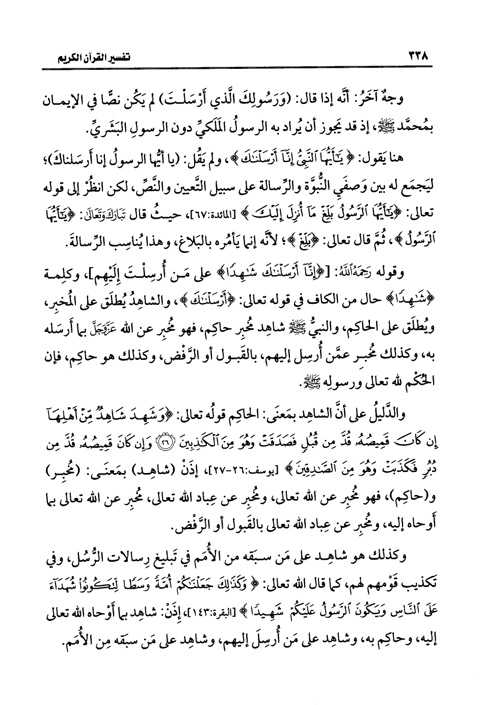 والدَّليلُ على أنَّ الشاهِد بمَعنَى: الحاكِم قولُه تعالى: {وَشَهِدَ شَاهِدٌ مِنْ أَهْلِهَا إِنْ كَانَ قَمِيصُهُ قُدَّ مِنْ قُبُلٍ فَصَدَقَتْ وَهُوَ مِنَ الْكَاذِبِينَ (٢٦) وَإِنْ كَانَ قَمِيصُهُ قُدَّ مِنْ دُبُرٍ فَكَذَبَتْ وَهُوَ مِنَ الصَّادِقِينَ} [يوسف: ٢٦ - ٢٧]، إذَنْ (شاهِد) بمَعنَى: (مخُبِر) و (حاكِم)، فهو مُخبِر عن اللَّه تعالى، ومخُبِر عن عِباد اللَّه تعالى، مخُبِر عن اللَّه تعالى بما أَوحاه إليه، ومُخبِر عن عِباد اللَّه تعالى بالقَبول أو الرَّفْض.