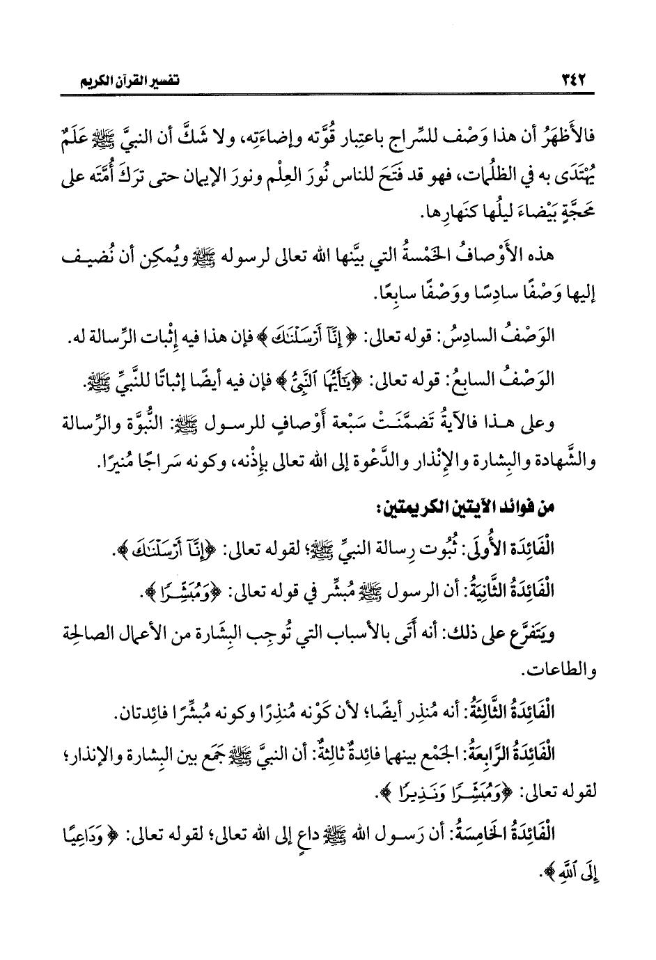 وعلى هذا فالآيةُ تَضمَّنَتْ سَبْعة أَوْصافٍ للرسول -صلى اللَّه عليه وسلم-: النُّبوَّة والرِّسالة والشَّهادة والبِشارة والإِنْذار والدَّعْوة إلى اللَّه تعالى بإِذْنه، وكونه سَراجًا مُنيرًا.