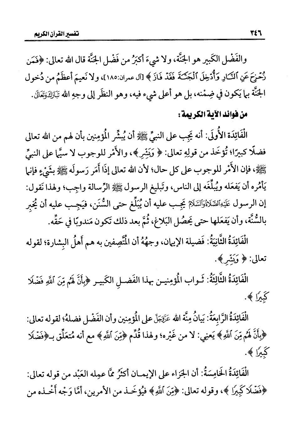 الْفَائِدَة الأُولَى: أنه يَجِب على النبيِّ -صلى اللَّه عليه وسلم- أن يُبشِّر المُؤمِنين بأن لهم من اللَّه تعالى فضلًا كبيرًا؛ تُؤخَذ من قولِهِ تعالى: {وَبَشِّرِ}، والأَمْر للوجوب لا سيَّما على النبيِّ -صلى اللَّه عليه وسلم-، فإن الأَمْر للوجوب على كل حال؛ لأن اللَّه تعالى إذَا أَمَر رَسولَه -صلى اللَّه عليه وسلم- بشَيْءٍ فإنما يَأمُره أن يَفعَله ويُبلِّغَه إلى الناس، وتَبليغ الرسول -صلى اللَّه عليه وسلم- الرِّسالة واجِب؛ ولهذا نَقول: إن الرسول عَلَيْهِ الصَّلَاةُ وَالسَّلَامُ يَجِب عليه أن يُبَلِّغ حتى السُّنَن، فيَجِب عليه أن يُخبِر بالسُّنَّة، وأن يَفعَلها حتى يَحصُل البَلاغ، ثُمَّ بعد ذلك تَكون مَندوبًا في حَقِّه.