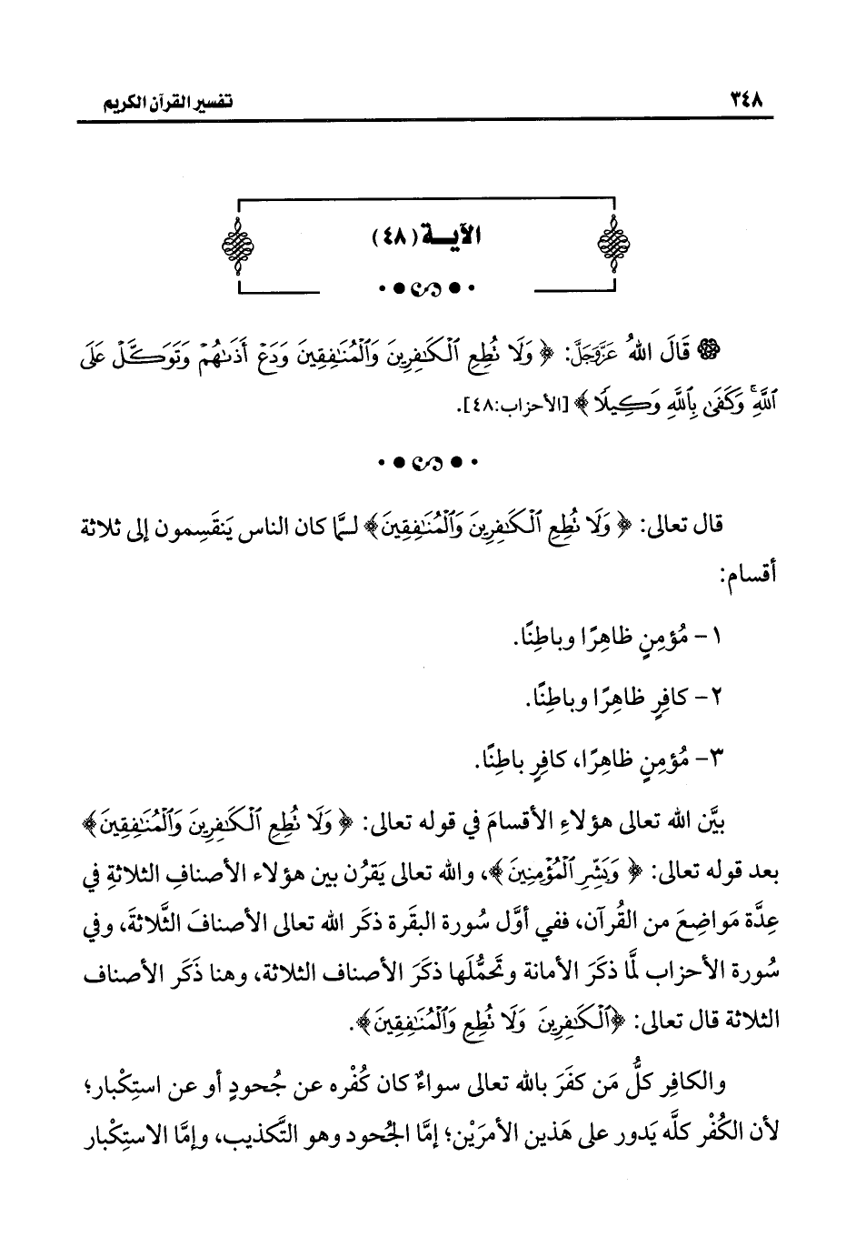بيَّن اللَّه تعالى هؤلاءِ الأقسامَ في قوله تعالى: {وَلَا تُطِعِ الْكَافِرِينَ وَالْمُنَافِقِينَ} بعد قوله تعالى: {وَبَشِّرِ الْمُؤْمِنِينَ}، واللَّه تعالى يَقرُن بين هؤلاء الأصنافِ الثلاثةِ في عِدَّة مَواضِعَ من القُرآن، ففي أوَّل سُورة البقَرة ذكَر اللَّه تعالى الأصنافَ الثَّلاثةَ، وفي سُورة الأحزاب لمَّا ذكَرَ الأمانة وتَحمُّلَها ذكَرَ الأصناف الثلاثة، وهنا ذَكَر الأصناف الثلاثة قال تعالى: {وَلَا تُطِعِ الْكَافِرِينَ وَالْمُنَافِقِينَ}.