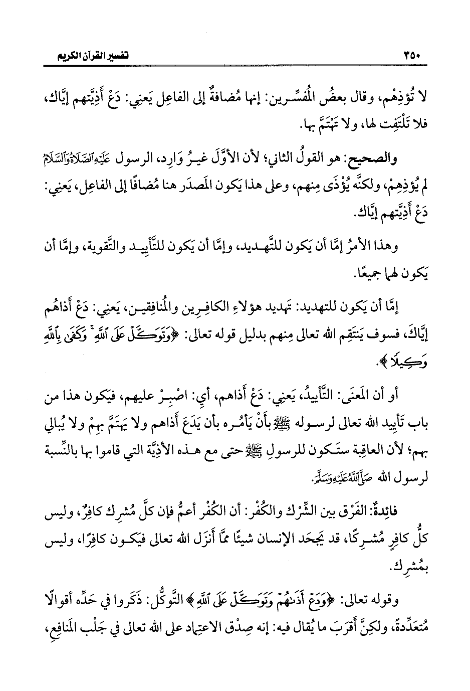 أو أن المَعنَى: التَّاييدُ، يَعنِي: دع أَذاهم، أي: اصْبِرْ عليهم، فيَكون هذا من باب تَأيِيد اللَّه تعالى لرسوله -صلى اللَّه عليه وسلم- بأَنْ يَأمُره بأن يَدَعَ أَذاهم ولا يَهتَمَّ بهِمْ ولا يُبالي بهم؛ لأن العاقِبة ستَكون للرسولِ -صلى اللَّه عليه وسلم- حتى مع هذه الأذِيَّة التي قاموا بها بالنِّسبة لرسول اللَّه -صلى اللَّه عليه وسلم-.
