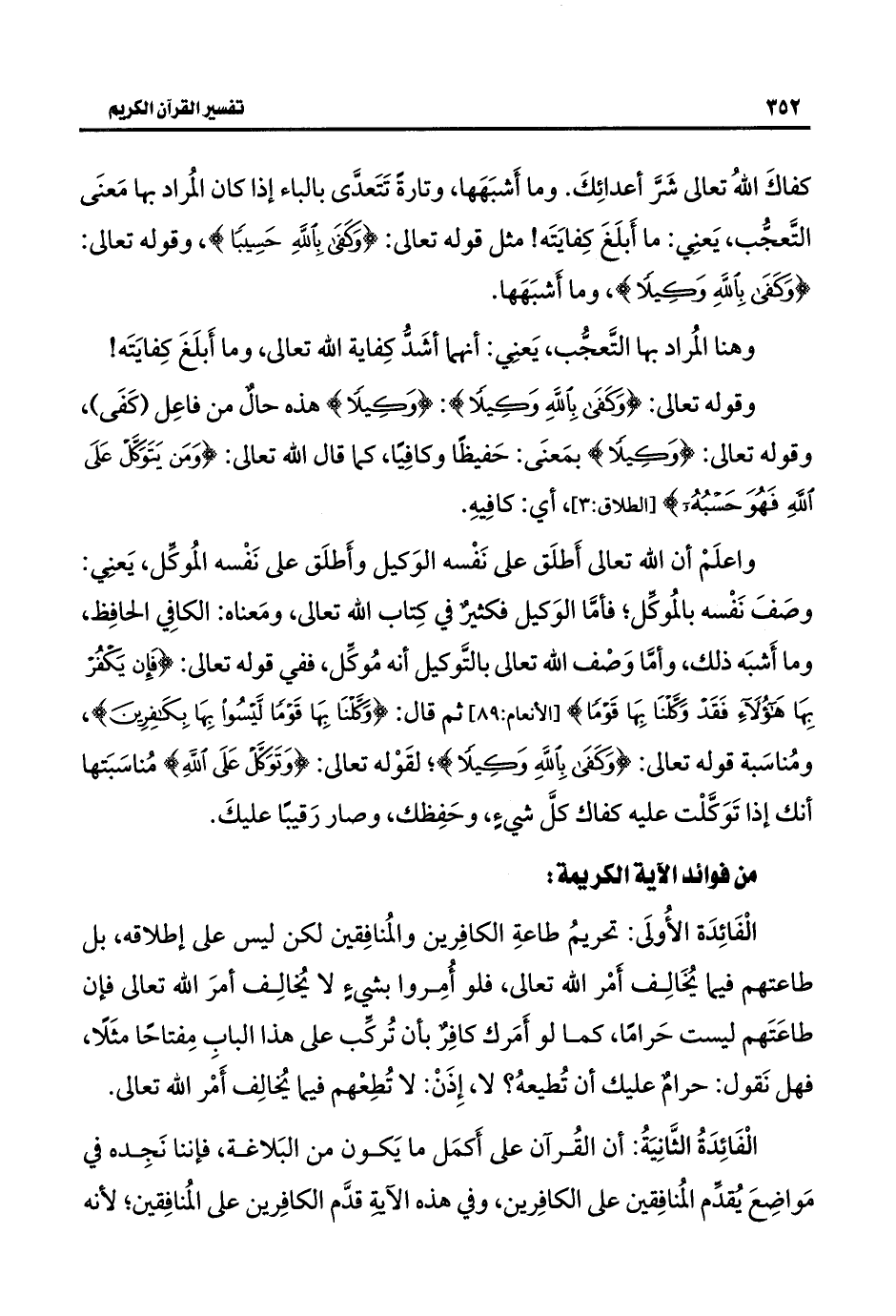 واعلَمْ أن اللَّه تعالى أَطلَق على نَفْسه الوَكيل وأَطلَق على نَفْسه المُوكِّل، يَعنِي: وصَفَ نَفْسه بالمُوكِّل؛ فأمَّا الوَكيل فكثيرٌ في كِتاب اللَّه تعالى، ومَعناه: الكافِي الحافِظ، وما أَشبَه ذلك، وأمَّا وَصْف اللَّه تعالى بالتَّوكيل أنه مُوكِّل، ففي قوله تعالى: {فَإِنْ يَكْفُرْ بِهَا هَؤُلَاءِ فَقَدْ وَكَّلْنَا بِهَا قَوْمًا} [الأنعام: ٨٩] ثم قال: {وَكَّلْنَا بِهَا قَوْمًا لَيْسُوا بِهَا بِكَافِرِينَ}، ومُناسَبة قوله تعالى: {وَكَفَى بِاللَّهِ وَكِيلًا}؛ لقَوْله تعالى: {وَتَوَكَّلْ عَلَى اللَّهِ} مُناسَبَتها أنك إذا تَوَكَّلْت عليه كفاك كلَّ شيءٍ، وحَفِظك، وصار رَقيبًا عليكَ.