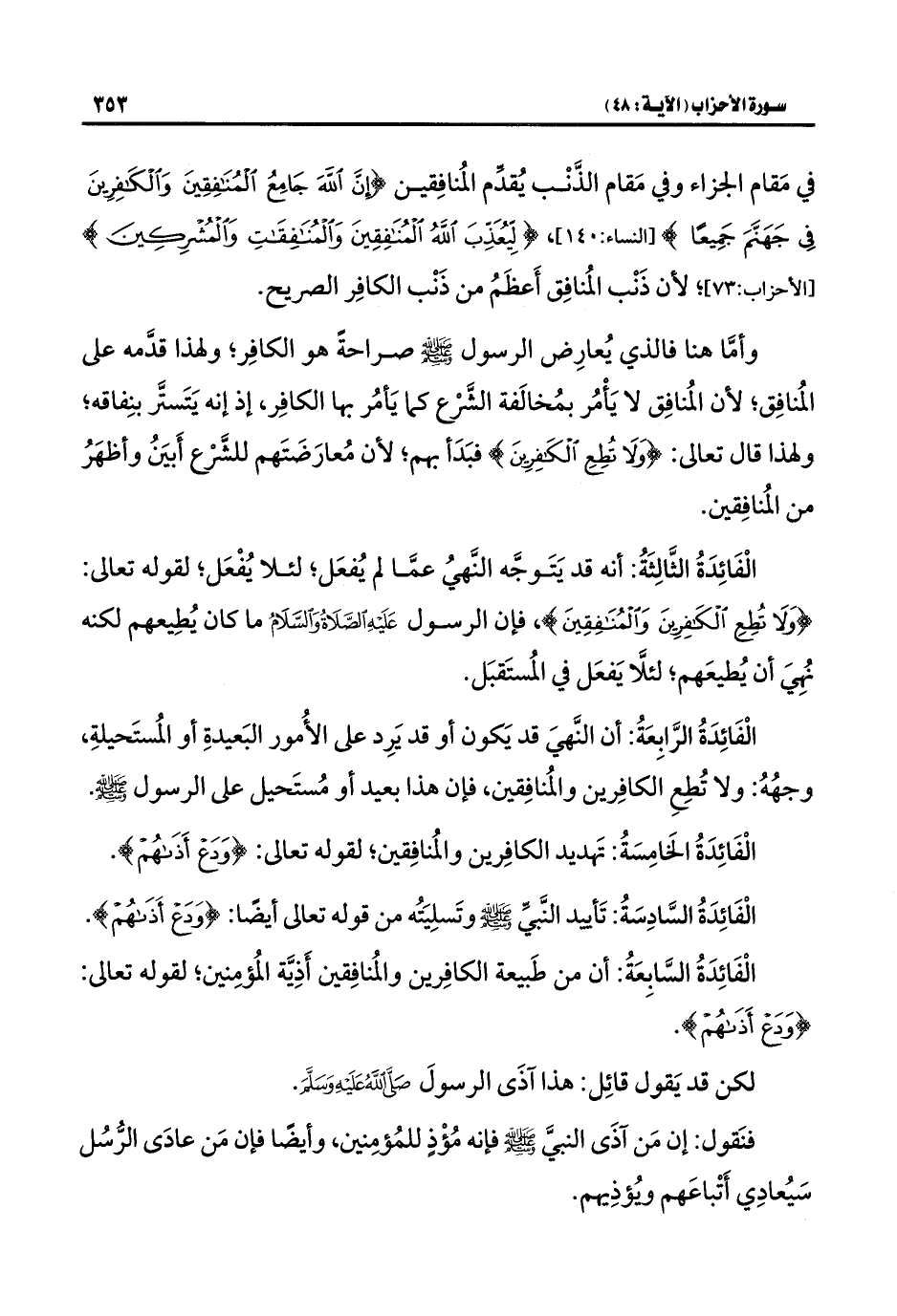 الْفَائِدَةُ الثَّالِثَةُ: أنه قد يَتَوجَّه النَّهيُ عمَّا لم يُفعَل؛ لئلا يُفْعَل؛ لقوله تعالى: {وَلَا تُطِعِ الْكَافِرِينَ وَالْمُنَافِقِينَ}، فإن الرسول عَلَيْهِ الصَّلَاةُ وَالسَّلَامُ ما كان يُطِيعهم لكنه نُهِيَ أن يُطيعَهم؛ لئلَّا يَفعَل في المُستَقبَل.