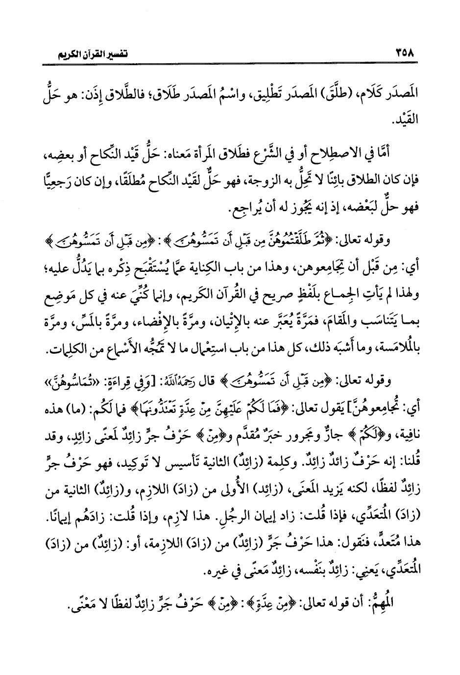 وقوله تعالى: {مِنْ قَبْلِ أَنْ تَمَسُّوهُنَّ} قال رَحِمَهُ اللَّهُ: [وَفي قِراءَةٍ: "تُمَاسُّوهُنَّ" أي: تُجامِعوهُنَّ] يَقول تعالى: {فَمَا لَكُمْ عَلَيْهِنَّ مِنْ عِدَّةٍ تَعْتَدُّونَهَا} فما لَكُم: (ما) هذه نافِية، و {لَكُمْ} جارٌّ ومجَرور خبَرٌ مُقدَّم و {مِنْ} حَرْفُ جرٍّ زائِدٌ لمَعنًى زائِدٍ، وقد قُلنا: إنه حَرْفٌ زائدٌ زائِدٌ. وكلِمة (زائِدٌ) الثانية تَأسيس لا تَوكِيد، فهو حَرْفُ جرٍّ زائِدٌ لفظًا، لكنه يَزيد المَعنَى، (زائِد) الأُولى من (زادَ) اللازِم، و (زائِدٌ) الثانية من (زادَ) المُتعَدِّي، فإذا قُلت: زاد إيمان الرجُلِ. هذا لازِم، وإذا قُلت: زادَهُم إيمانًا. هذا مُتَعدٍّ، فنَقول: هذا حَرْفُ جَرٍّ (زائِدٌ) من (زادَ) اللازِمة، أو: (زائِدٌ) من (زادَ) المُتعَدِّي، يَعنِي: زائِدٌ بنَفْسه، زائِدٌ مَعنًى في غيره.