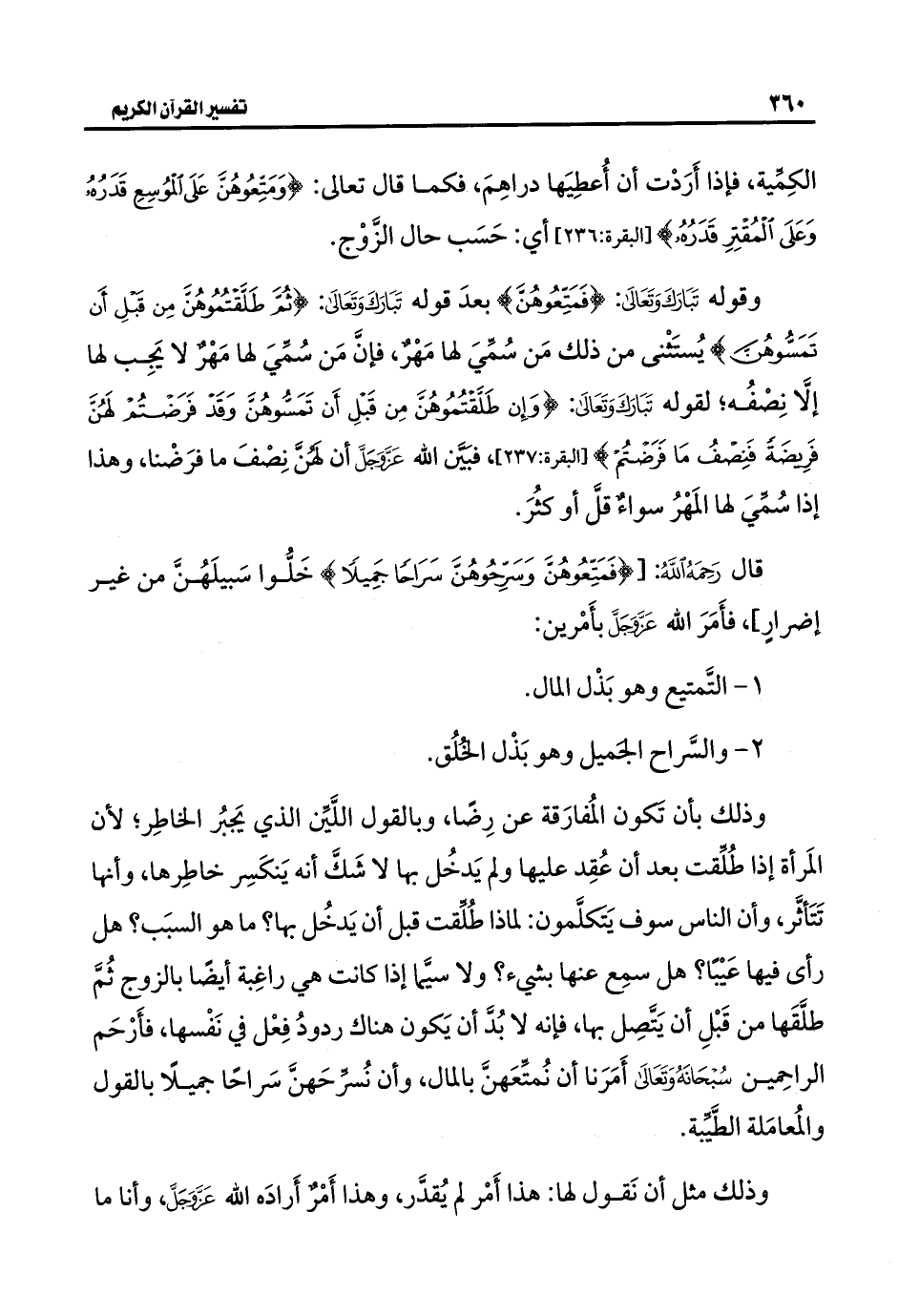 قال رَحِمَهُ اللَّهُ: [{فَمَتِّعُوهُنَّ وَسَرِّحُوهُنَّ سَرَاحًا جَمِيلًا} خَلُّوا سَبيلَهُنَّ من غير إضرارٍ]، فأَمَرَ اللَّه عَزَّ وَجَلَّ بأَمْرين: