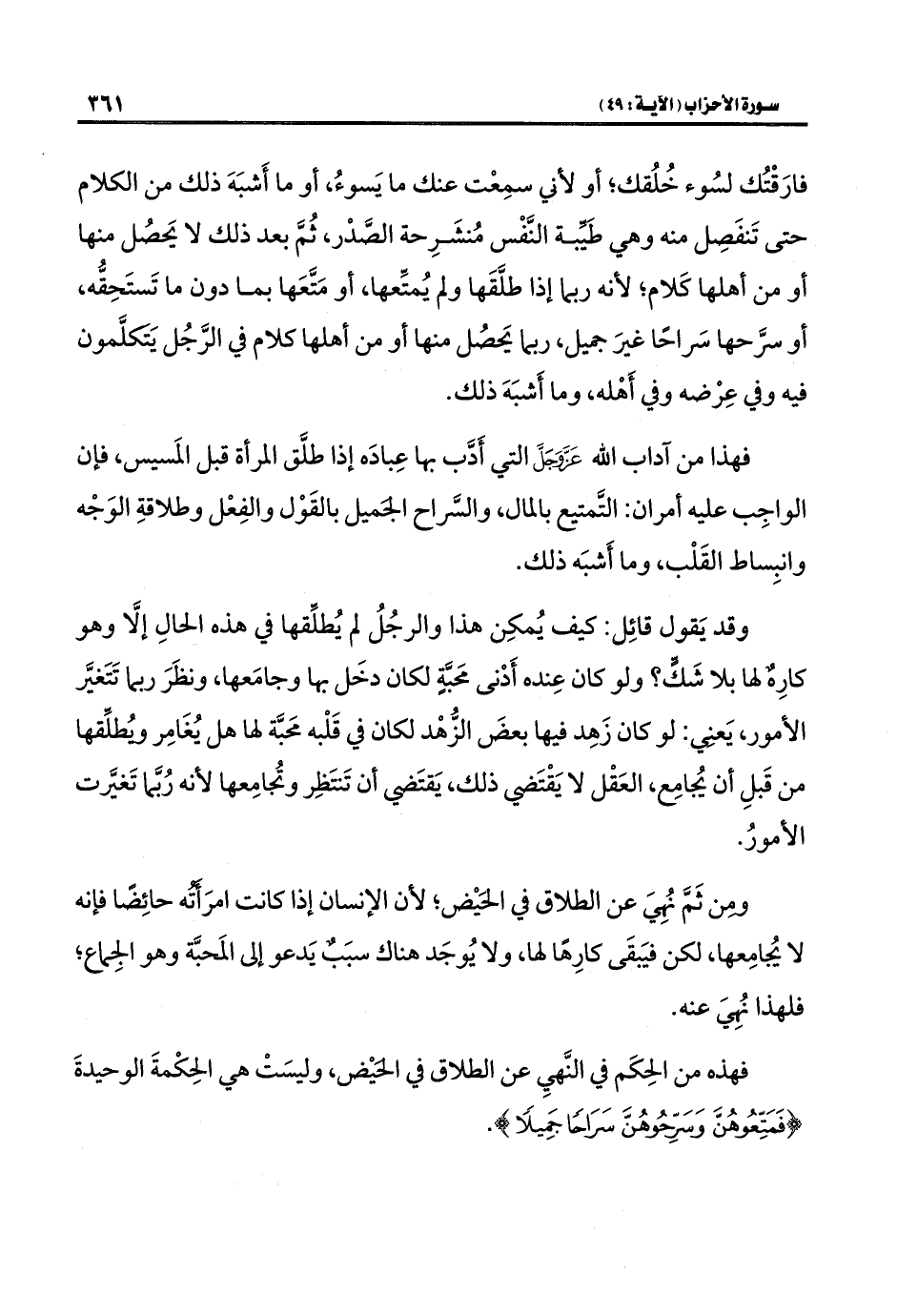 فهذا من آداب اللَّه عَزَّ وَجَلَّ التي أَدَّب بها عِبادَه إذا طلَّق المرأة قبل المَسيس، فإن الواجِب عليه أمران: التَّمتيع بالمال، والسَّراح الجميل بالقَوْل والفِعْل وطلاقةِ الوَجْه وانبِساط القَلْب، وما أَشبَه ذلك.