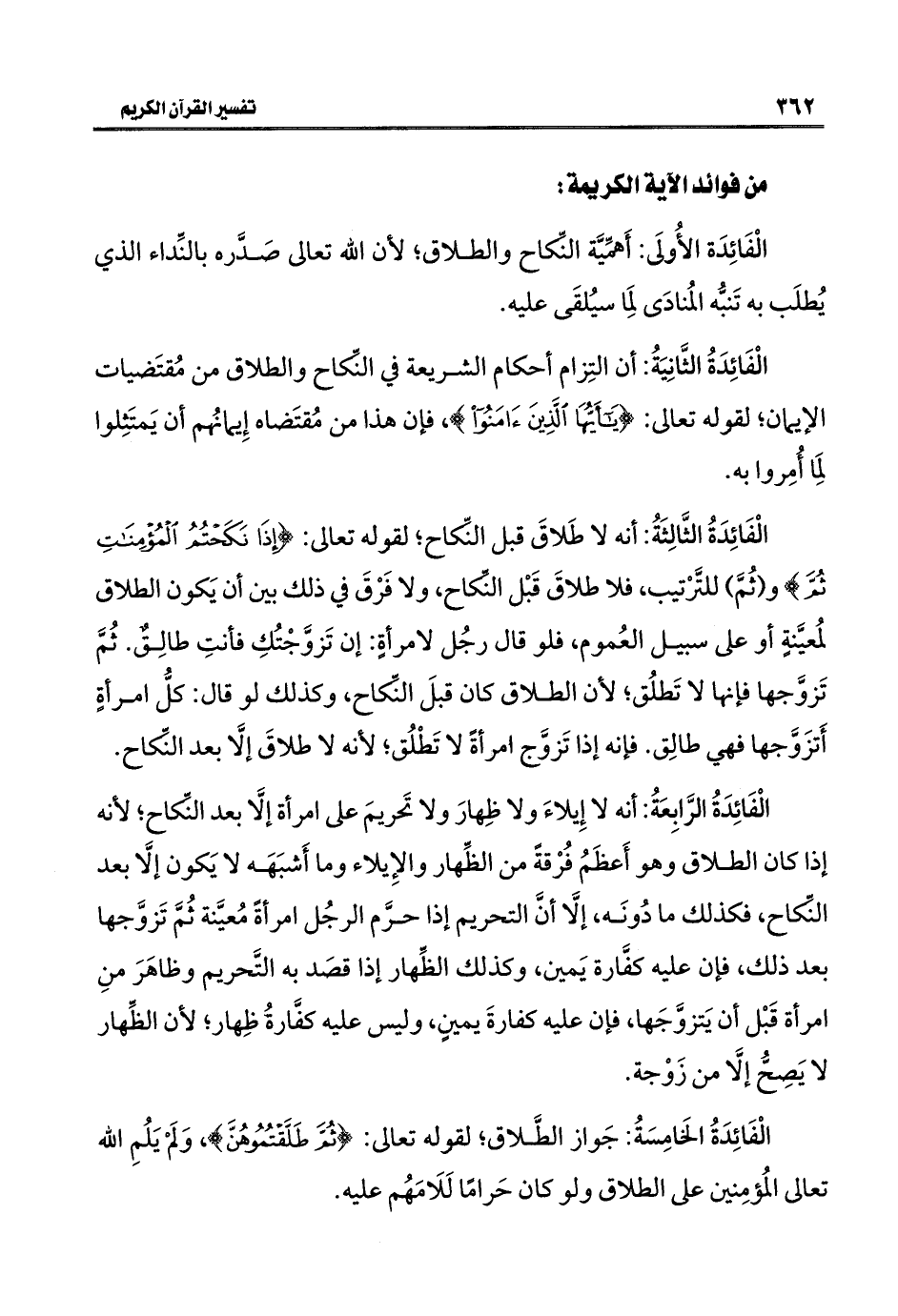 الْفَائِدَةُ الثَّالِثَةُ: أنه لا طَلاقَ قبل النِّكاح؛ لقوله تعالى: {إِذَا نَكَحْتُمُ الْمُؤْمِنَاتِ ثُمَّ} و (ثُمَّ) للتَّرْتيب، فلا طلاقَ قَبْل النِّكاح، ولا فَرْقَ في ذلك بين أن يَكون الطلاق لمُعيَّنةٍ أو على سبيل العُموم، فلو قال رجُل لامرأةٍ: إن تَزوَّجْتُكِ فأنتِ طالِقٌ. ثُمَّ تَزوَّجها فإنها لا تَطلُق؛ لأن الطلاق كان قبلَ النِّكاح، وكذلك لو قال: كلُّ امرأةٍ أَتزَوَّجها فهي طالِق. فإنه إذا تَزوَّج امرأةً لا تَطْلُق؛ لأنه لا طلاقَ إلَّا بعد النِّكاح.