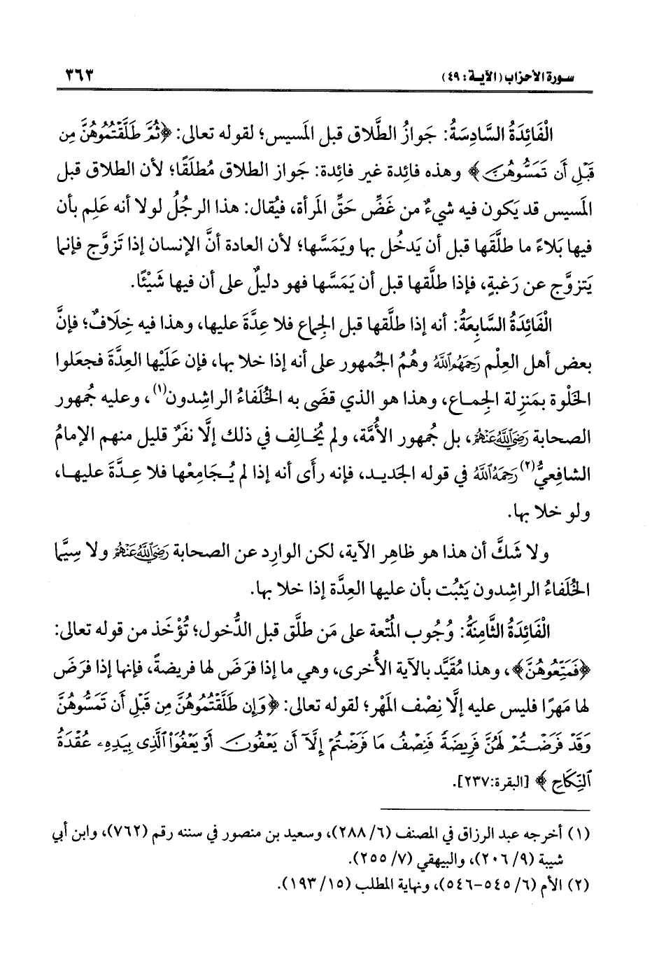 الْفَائِدَةُ السَّادِسَةُ: جَوازُ الطَّلاق قبل المَسيس؛ لقوله تعالى: {ثُمَّ طَلَّقْتُمُوهُنَّ مِنْ قَبْلِ أَنْ تَمَسُّوهُنَّ} وهذه فائِدة غير فائِدة: جَواز الطلاق مُطلَقًا؛ لأن الطلاق قبل المَسيس قد يَكون فيه شيءٌ من من غَضِّ حَقِّ المَرأة، فيُقال: هذا الرجُلُ لولا أنه عَلِم بأن فيها بَلاءً ما طلَّقَها قبل أن يَدخُل بها ويَمَسَّها، لأن العادة أنَّ الإنسان إذا تَزوَّج فإنما يَتزوَّج عن رَغبةٍ، فإذا طلَّقها قبل أن يَمَسَّها فهو دليلٌ على أن فيها شَيْئًا.